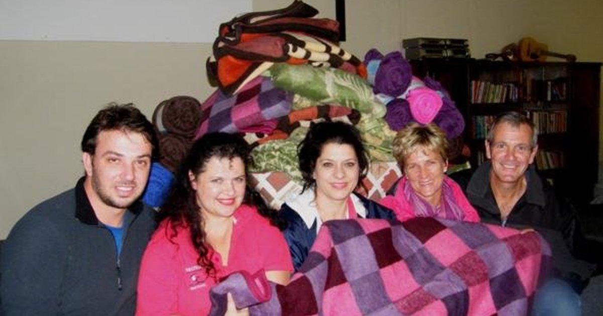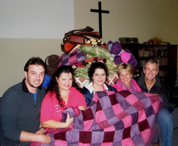 Gansbaai Melodrama Kindertrust was die eerstes met die skenking van komberse, met vlnr JP Coetzer, Schani Visser, Heidie Visser en Linda en Deon Kloppers van OMGEE Bedieninge