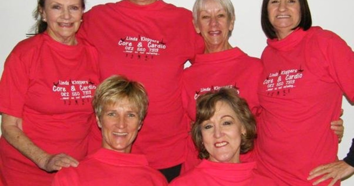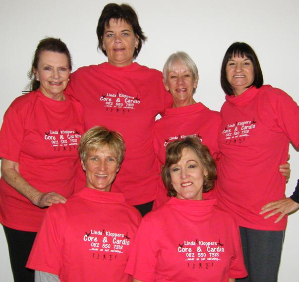 Die lede van Core & Cardio spog nou met hul eie oefenhemde. Dis bloedrooi, dis ge-embleem en dit simboliseer “…vir meer as net oefeninge…”. Te oordeel aan die groot opgewondenheid tydens die klasse, kan dit net lekker wees om ‘n passie vir oefeninge te hê, en dit is wat Linda Kloppers wel het. “My passie vir fiksheid en liefde vir oefening kom al ‘n lang pad aan,” vertel Linda. In Groblersdal, waar sy en haar eggenoot, Deon Kloppers en leraar van Omgee-Bedieninge, eers gewoon het, het Linda vir sowat 20 jaar haar eie gimnasium bedryf. “Na ‘n paar maande in Gansbaai het die oefen-gogga my weer beetgekry en het ek besef ek moet daarmee voortgaan,” vertel sy. Vir die oningeligte, “Core” verwys na maag- en postuurspiere, terwyl “Cardio” na kardiovaskulêre fiksheid verwys. Tans bied Linda groepsklasse aan, maar sy is ook ‘n gekwalifiseerde persoonlike instrukteur (“personal trainer”). Haar groepsklasse sluit onder andere pilates-, aerobics- en step-klasse in.