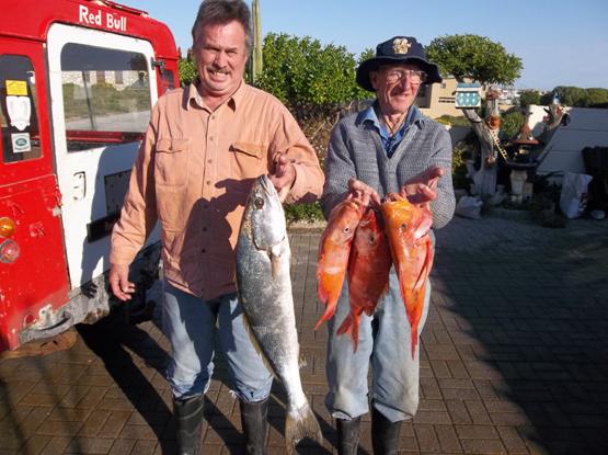 Eldo Marais (links), met sy geelbek en Jannie Roux met sy mooi rooivisse wat hulle naby Haaibank gevang het.