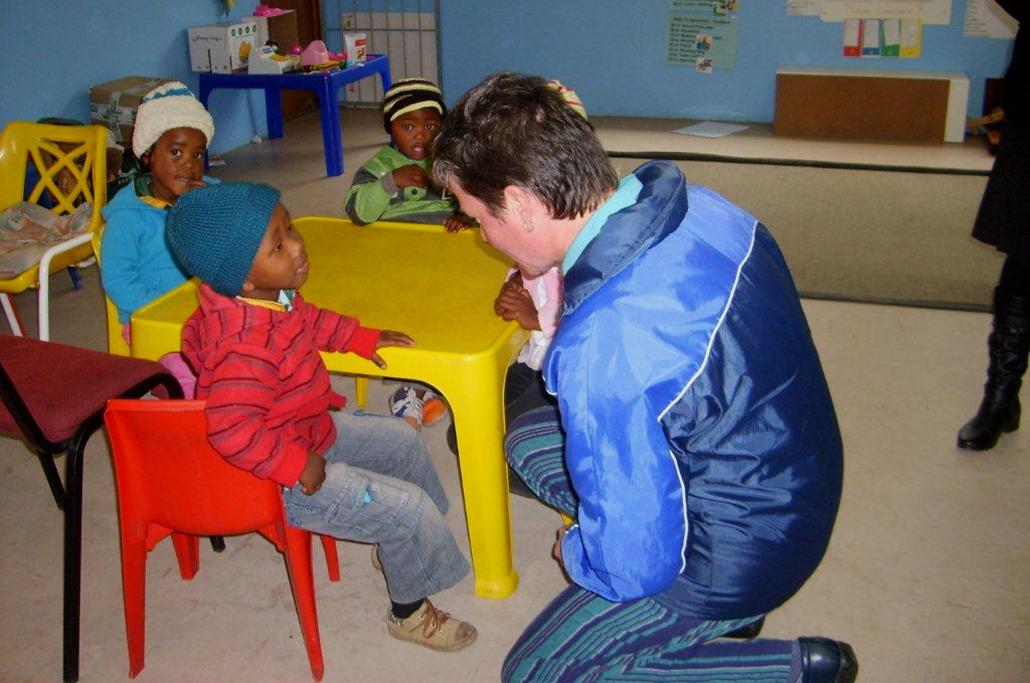 Kapt Gerda Groenewald “in gesprek” met een van Masakhane Créche se kleuters met sy nuwe mussie