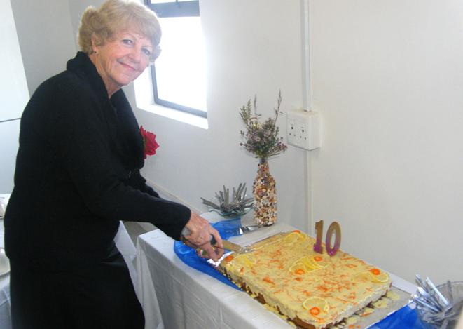 ” Na afloop van die seremoniële deel van die byeenkoms, het Alta van Niekerk, Vrouediens Streeksleier, die 10-jarige Verjaardagkoek gesny, waarna gemeentelede en gaste gesellig met verversings saamgekuier het.