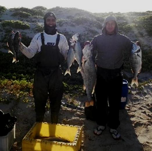 Die twee manne, net bekend as Yazeed (links) en Ikraam (regs), by galjoen, steenbras, elwe en ‘n kabeljou wat hulle Saterdagoggend vroeg by die Gruis gevang het. Wys jou net!