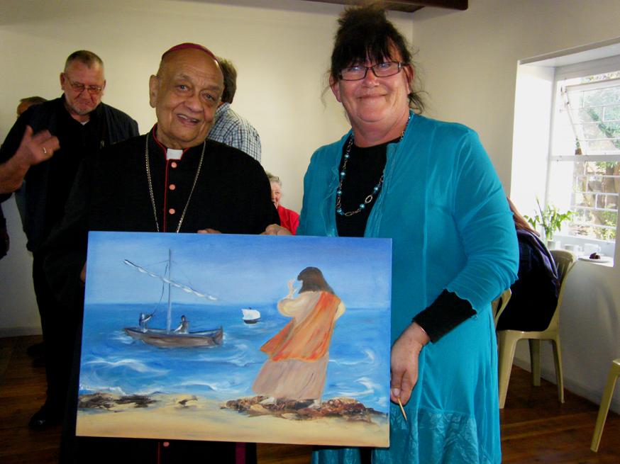 Angela Caie with her Fisherman’s painting for the hall, next to Archbishop Emeritus Henry