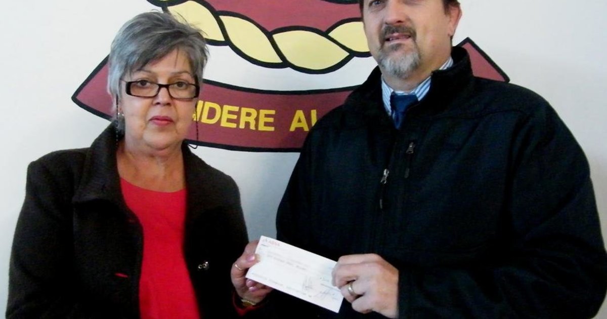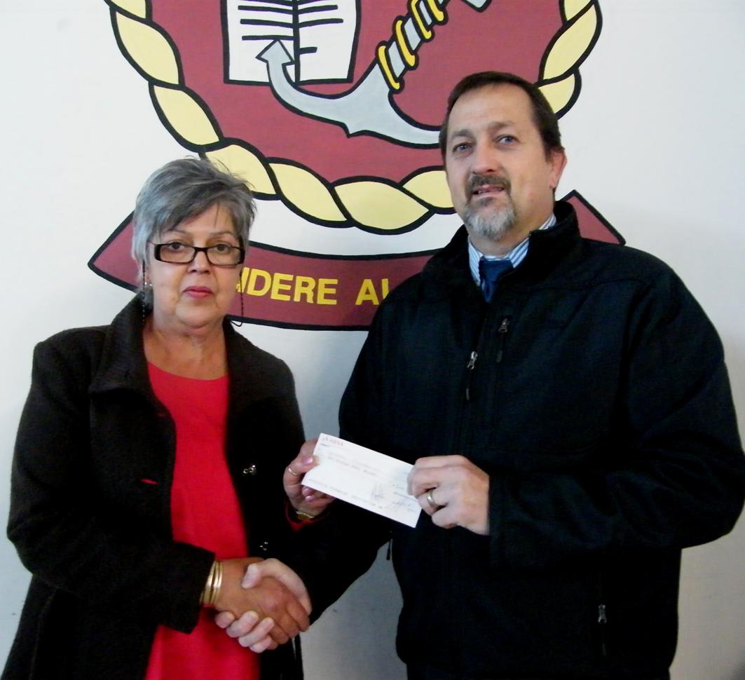 Christa de Vries oorhandig Gansbaai Lionsklub se welkome tjek ten bedrae van R3,000 aan Kobus Koekemoer vir Gansbaai Academia se 2013 Matriekafskeid