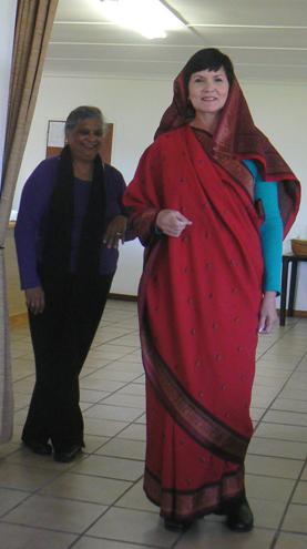Elizma vertel dat Pat Naidoo, wat self ook ‘n Bietouboslid is, die dames behoorlik in verwondering gelaat het toe sy gedemonstreer hoe ‘n sari gedrapeer word. “Binne minute het Pat dié 6m-lange stuk materiaal behendig omtower in ‘n pragtige kledingstuk met die mundani, ‘n besonderA mooi versierde gedeelte van die lap wat ekstra swier aan die uitrusting verleen,” sê Elizma. Die twee opgekommandeerde “modelle”, Sunet Heyns en Zendra van der Gryp, het bygedra om reg aan dié besonderse kledingstukke te laat geskied.