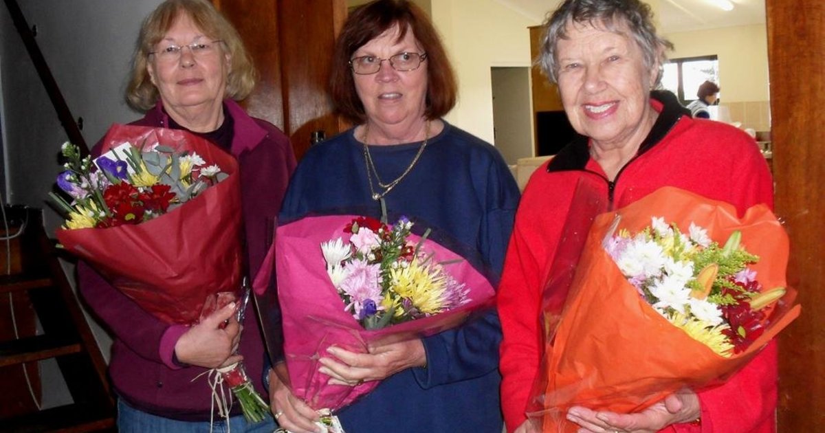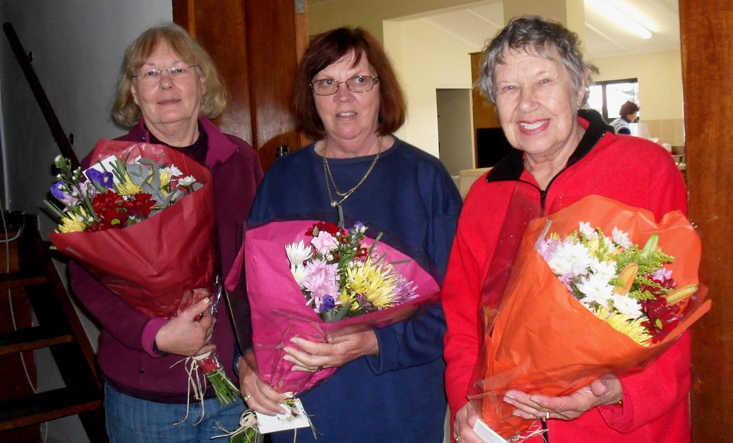 Die dames van die Woekermark wat blomme ontvang het, met vlnr Francia van Dyk, Petro van der Nest en Berta Brits