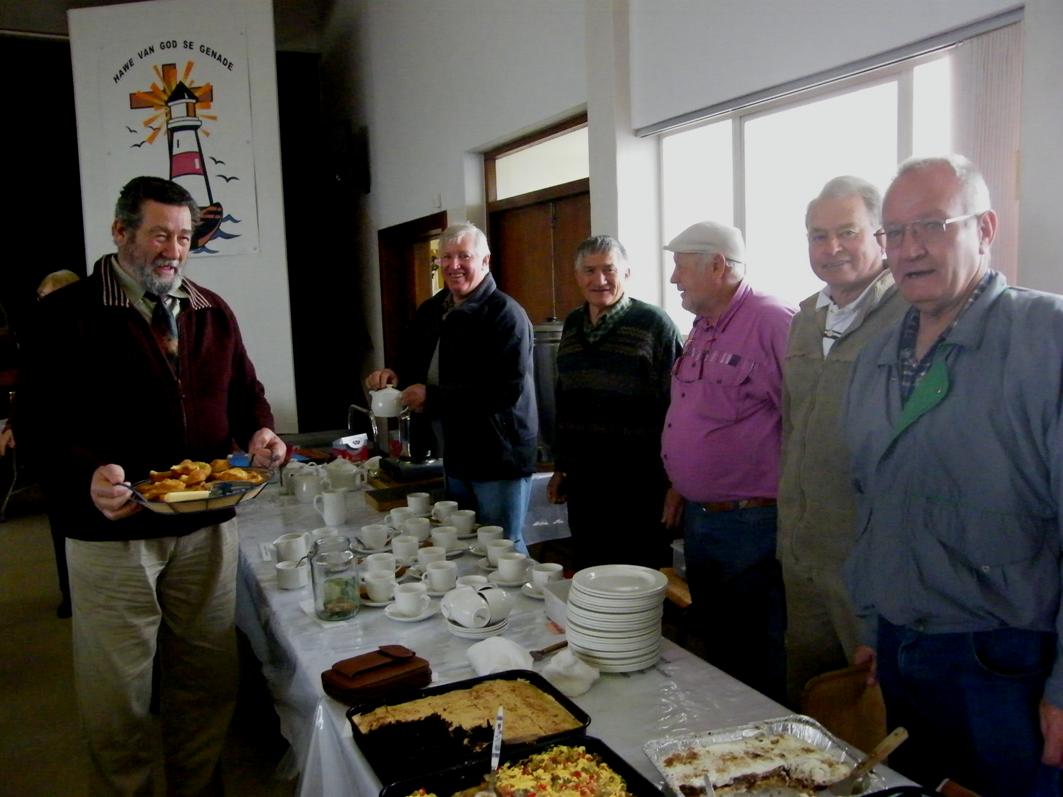 Dit was die “manne” se beurt om koek en tee/koffie te bedien, met Johan van Wyk (links) wat op dieselfde dag as die Woekermark verjaar het