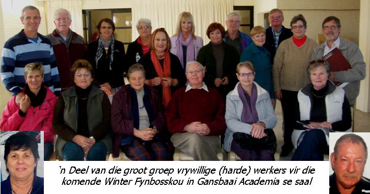 Vanjaar se Winter Fynbosskou gaan gepaard gaan met Musiek-in-die-Fynbos en Eet-in-die-Fynbos. Die gedugte span vrywillige Fynboswerkers is reeds in ‘n proses om Gansbaai Academia se saal in ‘n sprokieswêreld van fynbos en blomme te omskep. Bergtonele, watervalle, brand- en seetonele, spesies en veel sal besoekers vanaf 8-11 Augustus se asems wegslaan. Naas hierdie unieke uitstalling wat jaarliks groot bewondering afdwing, is daar vanjaar ‘n Teetuin (deurlopend) ten bate van Gansbaai Academia in die middel van die saal - ‘n ete tussen die fynbos.