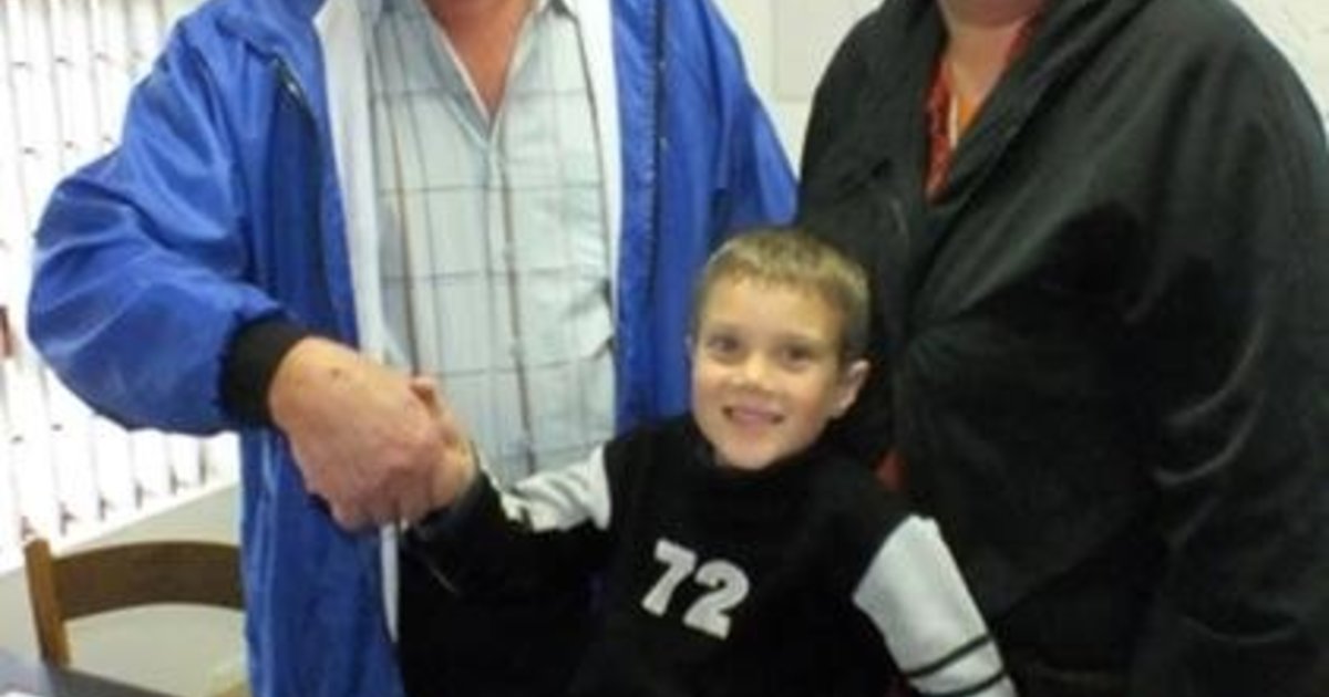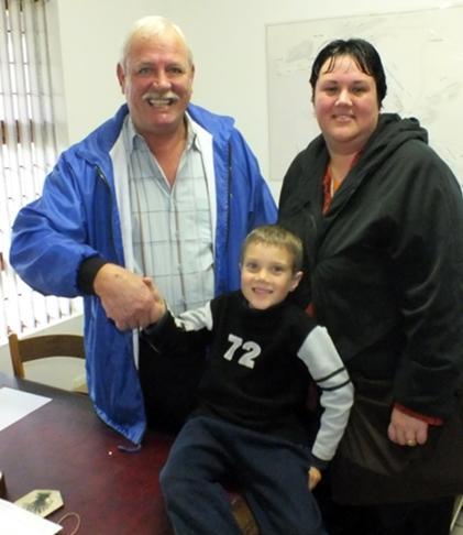 Boats van Staden, Peet en sy ma, Elize Staples. Peet glimlag van oor tot oor oor sy gehoorstuk wat die Gansbaai Lionsklub vir hom geskenk het.