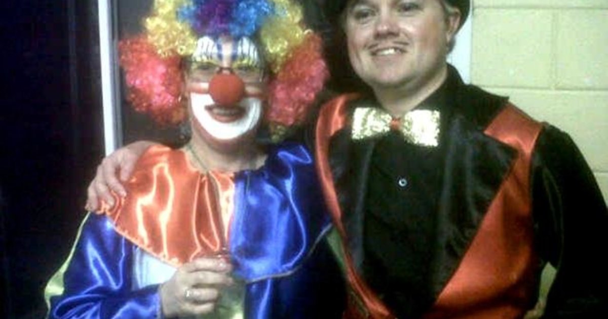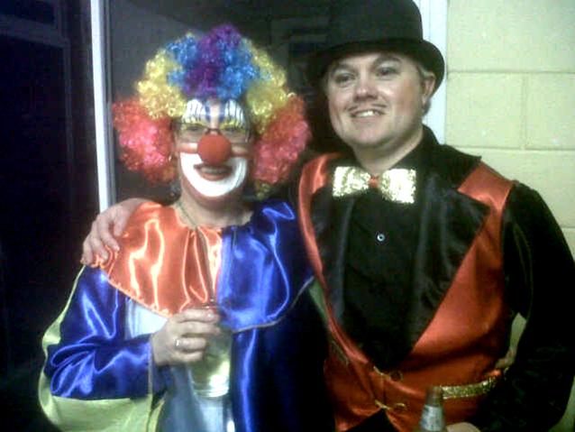 Andries Laubscher as die Sirkusmeester tydens sy 30ste verjaardagvieringe, saam met een van die narre