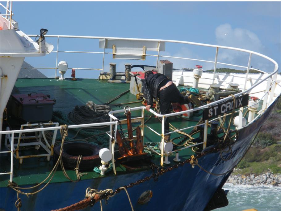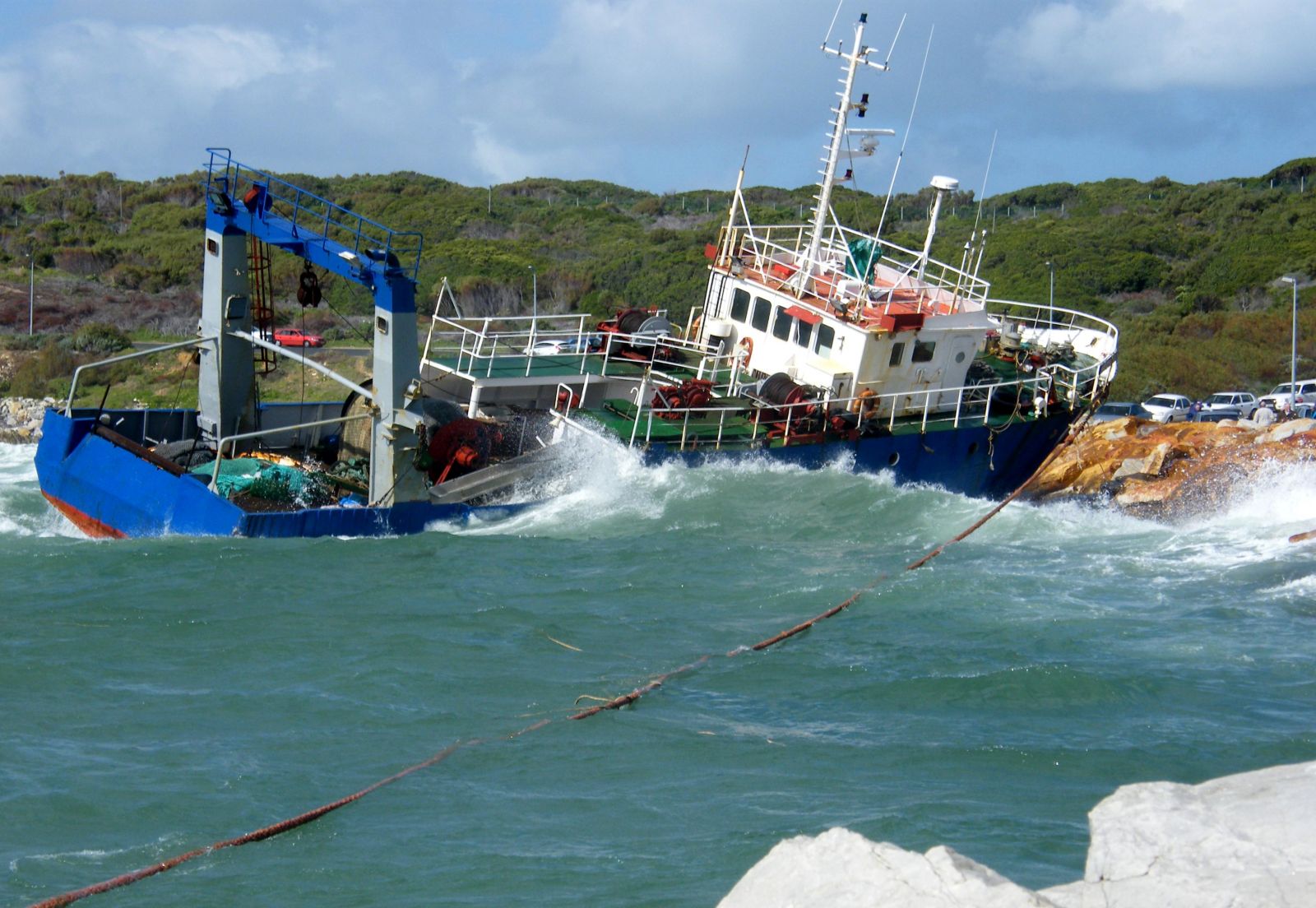 Stormsee met rukwinde van tot sowat 125km/uur het verlede Saterdag, 17 Augustus ernstige skade aan die stokvis-treiler, St Croix in Gansbaai se nuwe hawe aangerig. Die dik kettings waarmee die boot vasgemeer was, is letterlik soos vuurhoutjies gebreek. Die boot is in die boonste gedeelte van die nuwe hawe losgeruk en met ‘n draai meegesleur tot by die beginpunt van die muur op pad na waar die vistreilers vasgemeer word.