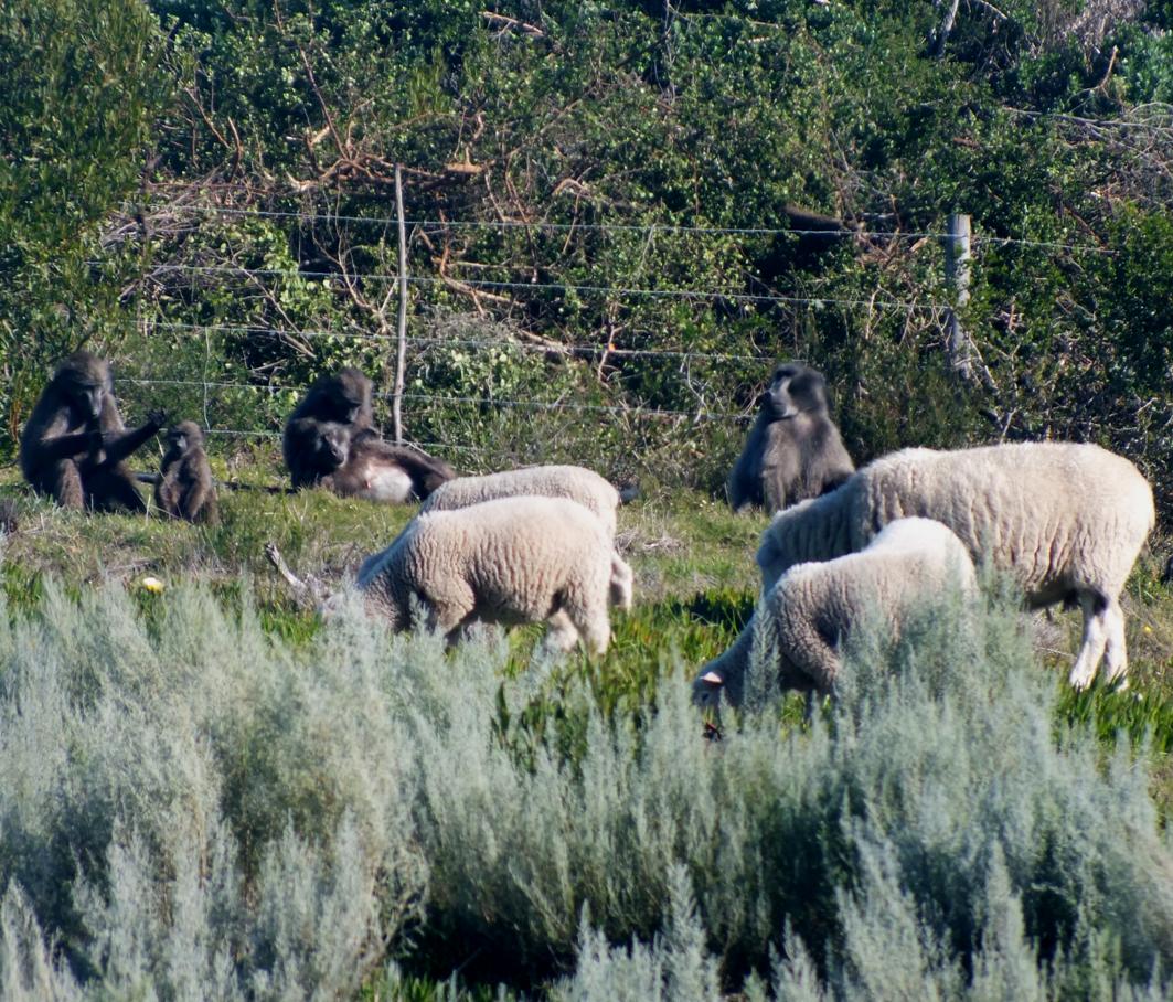 Hierdie trop bobbejane het Maandagmiddag óf skaapwagter kom speel óf soos wolf in skaapklere oor die R43 naby die Franskraalkruising op pad na Franskraal beweeg.