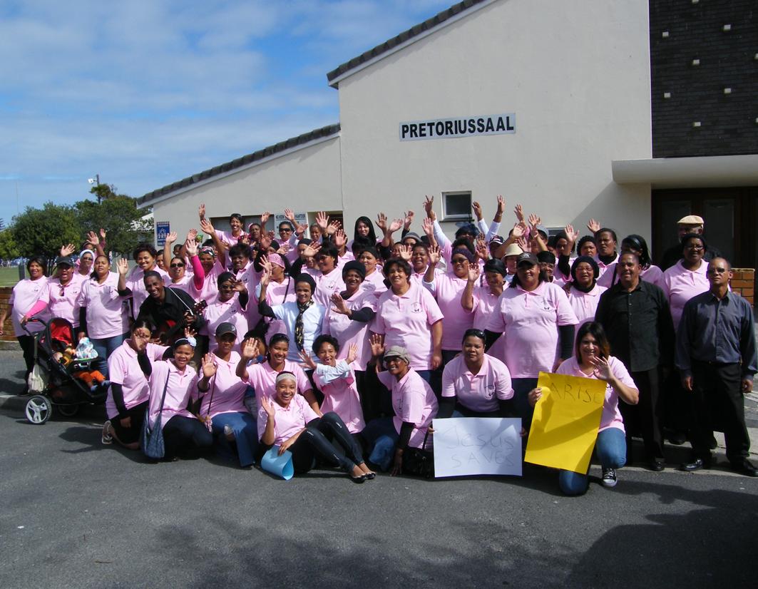 Die groot groep Interkerklike vrouens van Blompark voor die Pretoriussaal voordat daar met hulle Vrouemaand-optog begin is