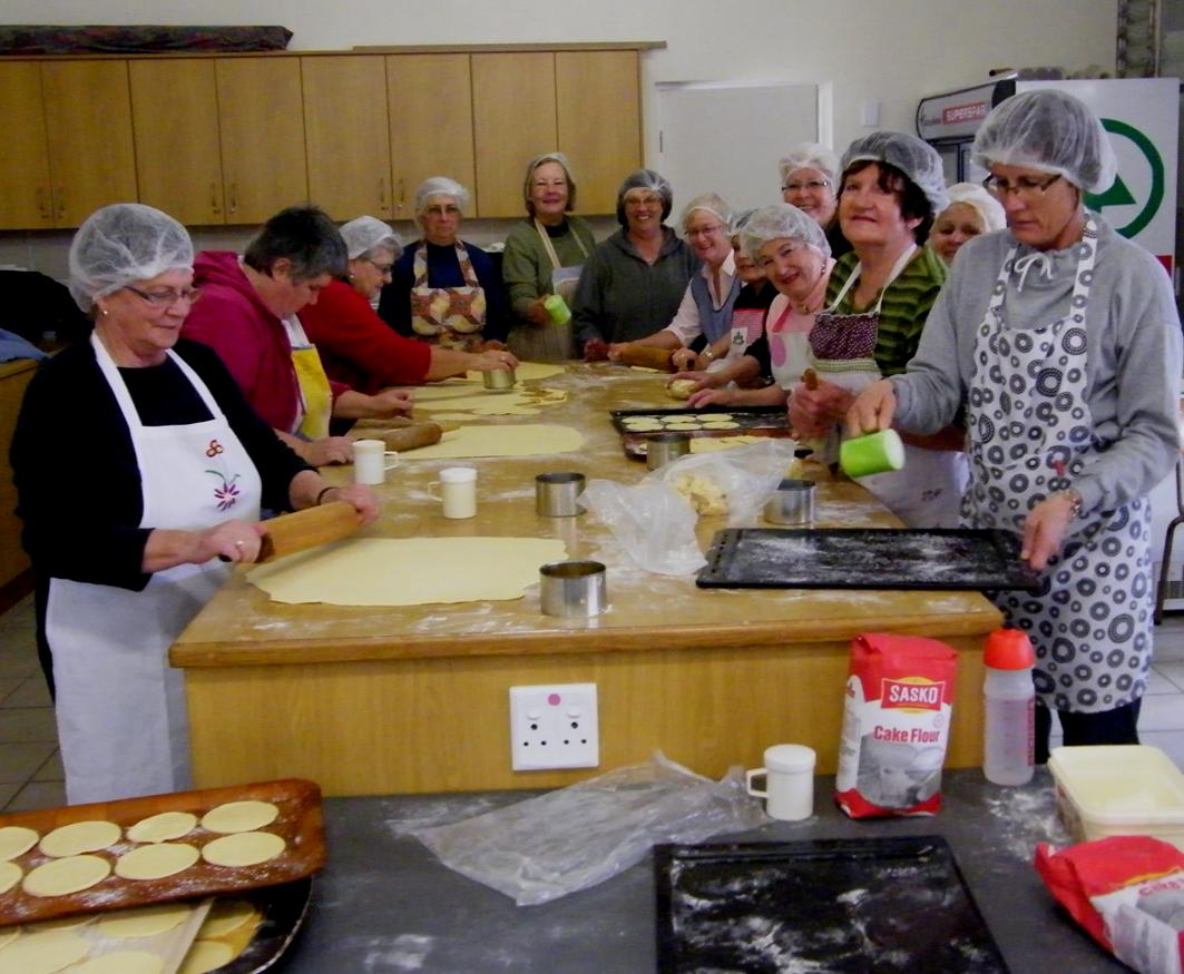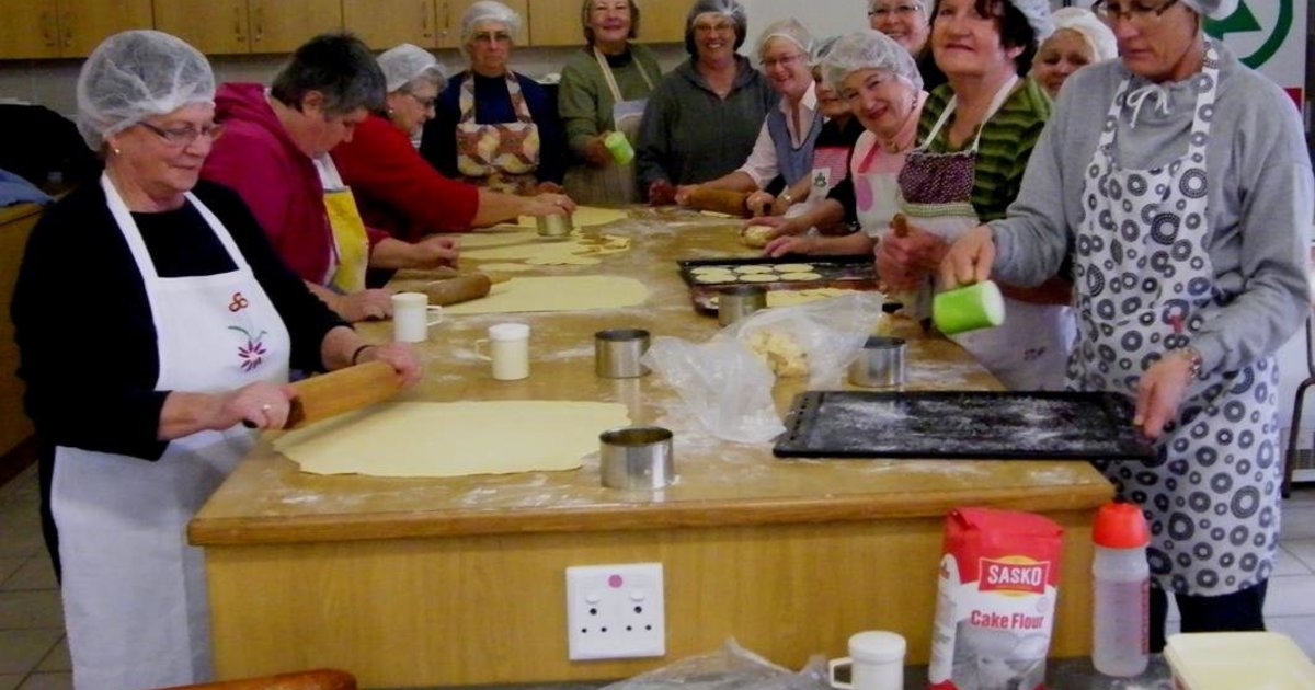 Die ywerige groep dames besig met die voorbereiding van Basaarpasteie wat vir Herberg-aan-See se basaar gebak gaan word