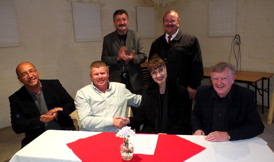 'n Samewerkingsooreenkoms is tydens die vergadering tussen die Sakekamer en die Munisipaliteit onderteken. Voor vlnr: Dr Christo van der Rheede, Fanie Bothma, Santie Reynecke-Naudé: Direkteur Finansies, Overstrand Munisipaliteit en Rdh Pieter Scholtz. Agter: Piet Badenhorst en Kat Myburgh.