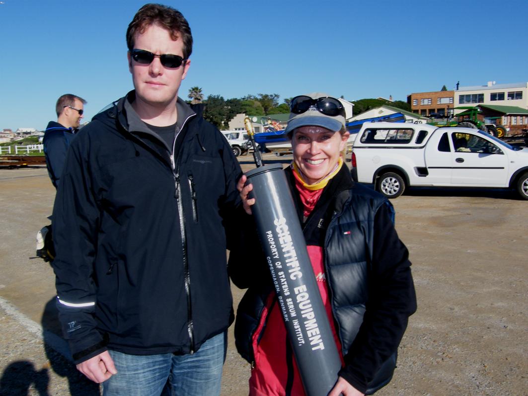 Harry Stone and Katja Vinding Peterson with one of the acoustic loggers which has been moored at Pearly Beach