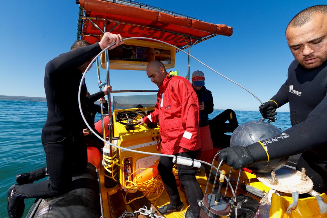 Divers on the boat, Isunami, preparing the acoustic loggers to be moored