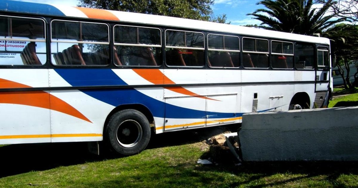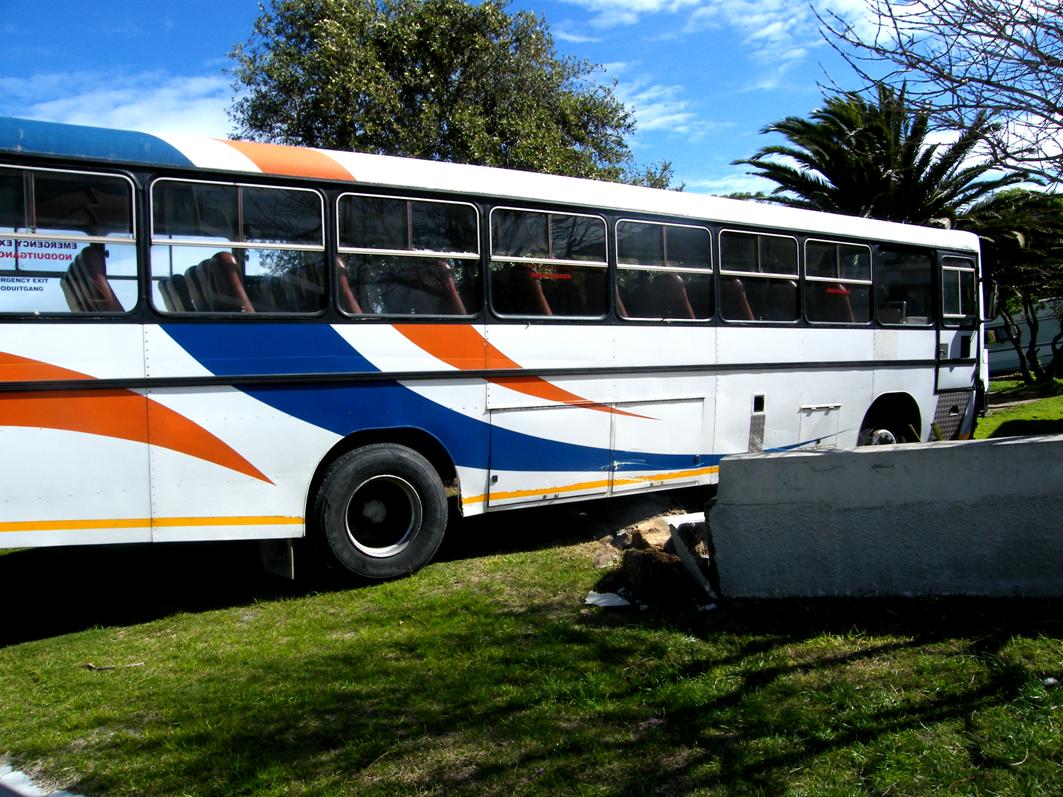 Die skoolbus van Genadendal wat deur ‘n betonheining gebars het, sonder ‘n bestuurder en al luierende