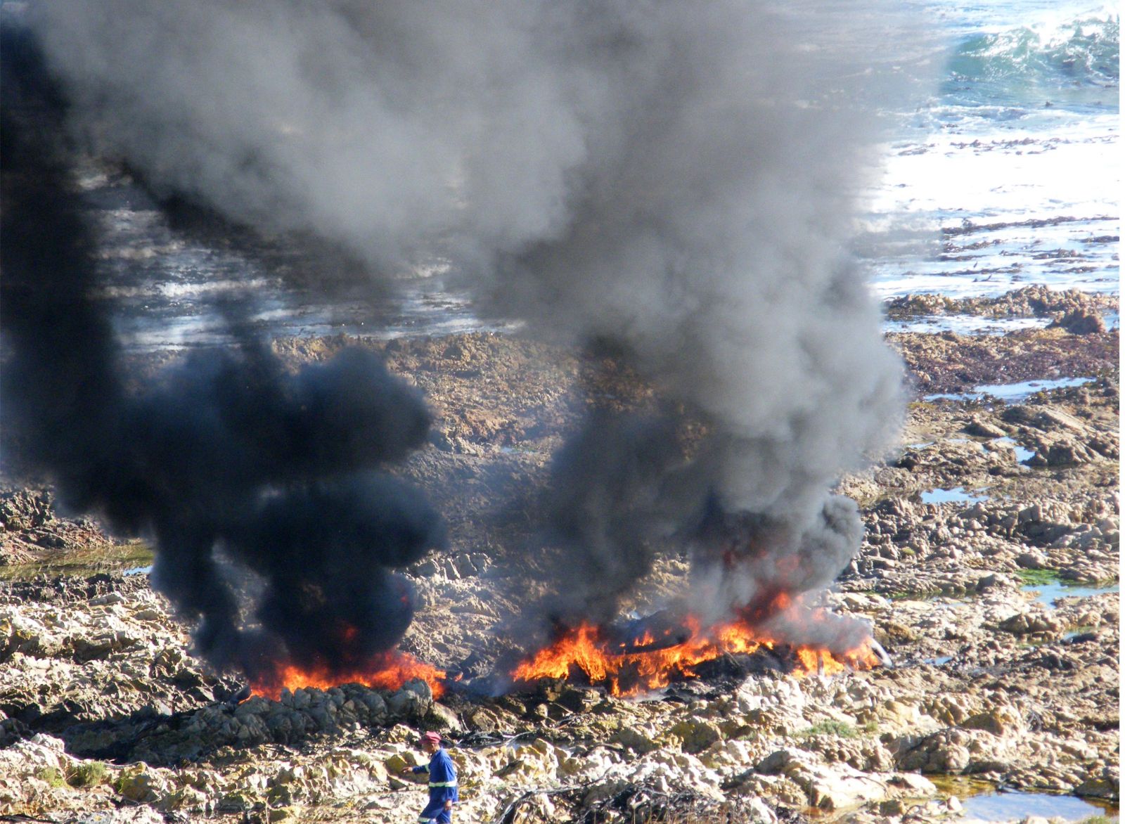 Die walviskarkas wat by die getypoel in Gansbaai uitgespoel het, is onlangs deur Gansbaai Munisipaliteit uitgebrand