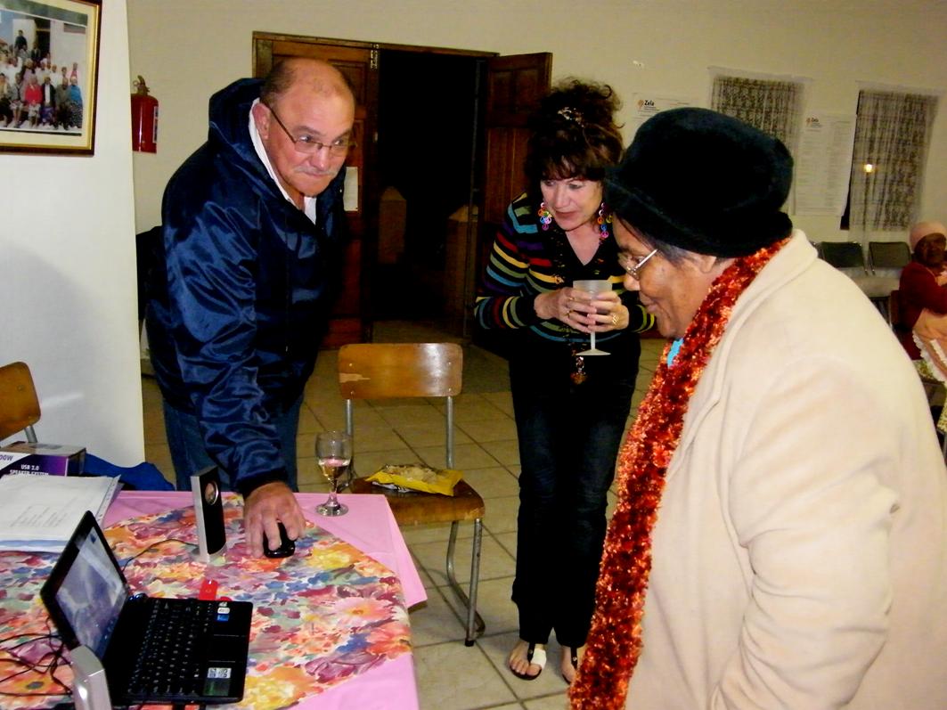 Silwerjare Dienssentrum se stigterslid, Magrieta Adams, kommunikeer met Jack Doyle van Engeland via skype, met Johan Wiese en Margi Muller by haar