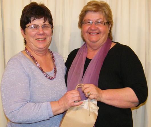 Glenda Kitley (links) oorhandig ‘n blyk van waardering aan die Overstrand Vrou van die Jaar, Mary Faure, tydens Gansbaai Toerisme Buro se Algemene Jaarvergadering