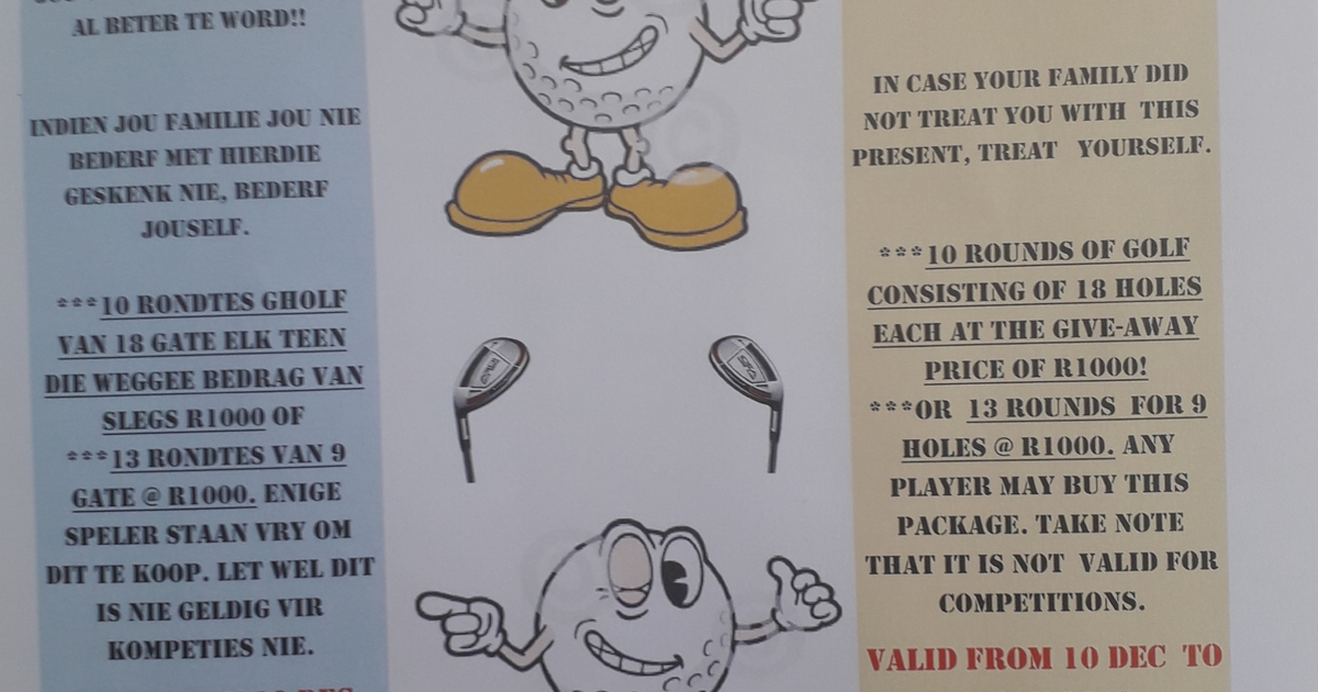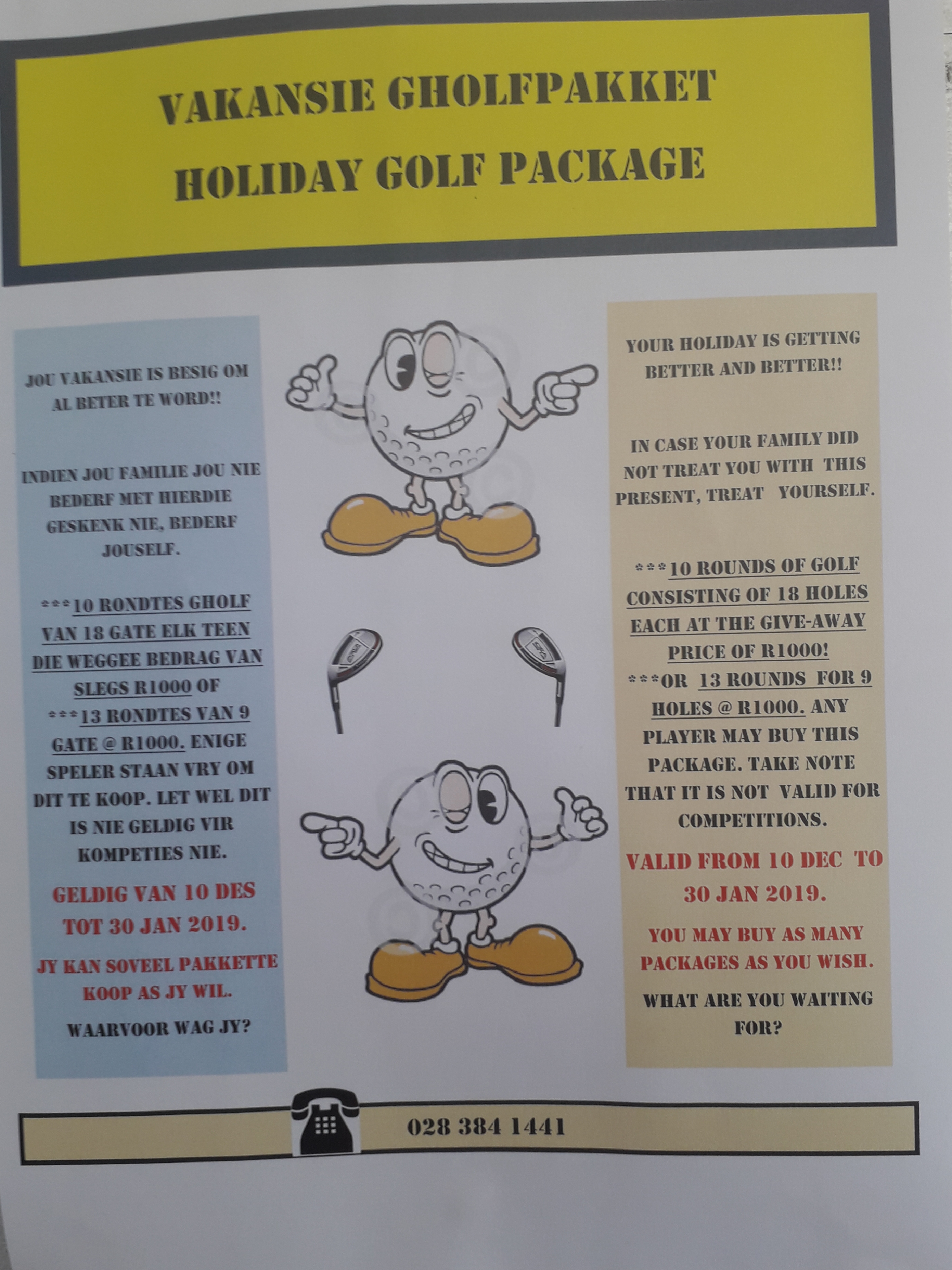 ***10 rounds of golf consisting of 19 holes each at the give-away price of R1000! OR 13 rounds of 9 HOLES each for R1000. Any player may buy this package. TAKE NOTE THAT IT IS NOT VALID FOR COMPETITIONS.