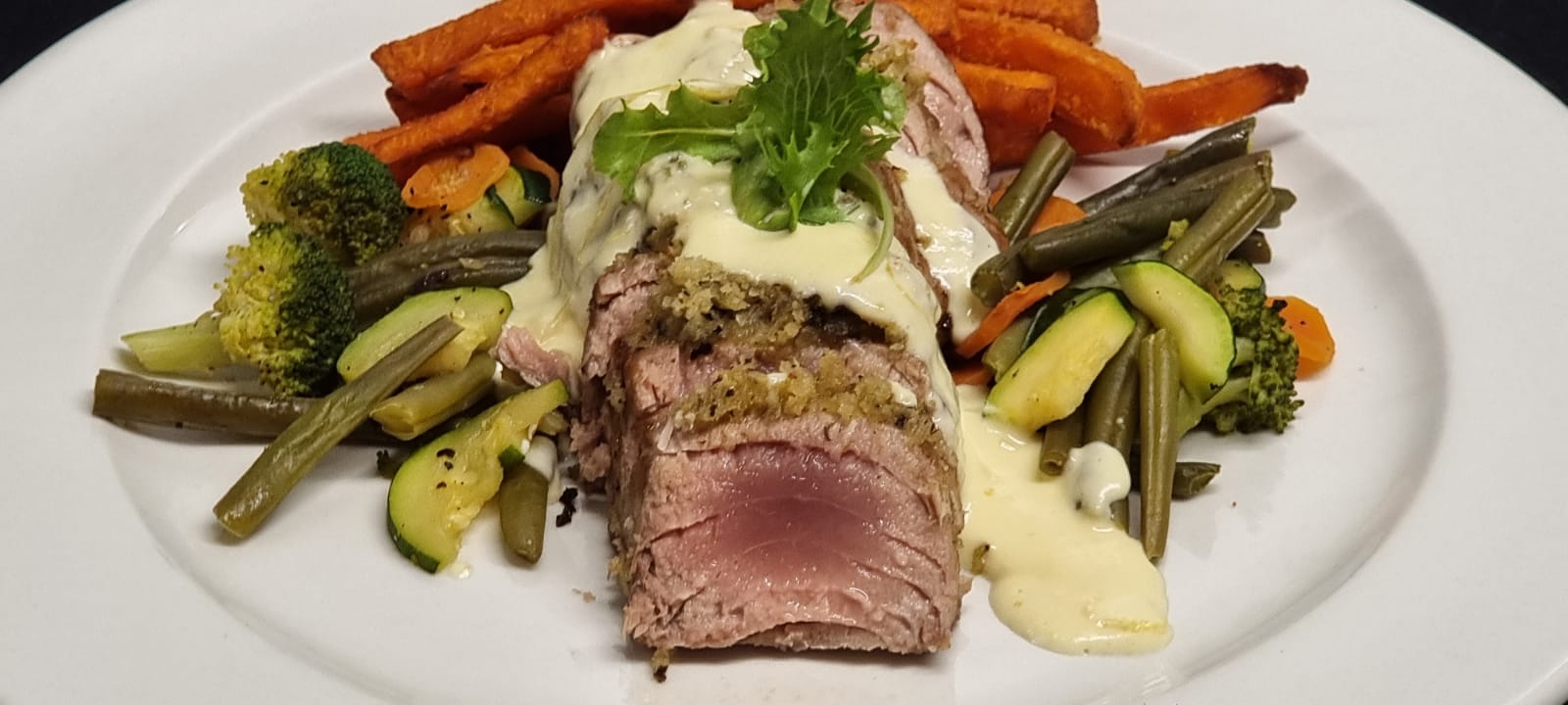 Smoked Kelp Crusted Tuna Steaks with Lemon Cream Sauce and Sweet Potato Fries - R195.00