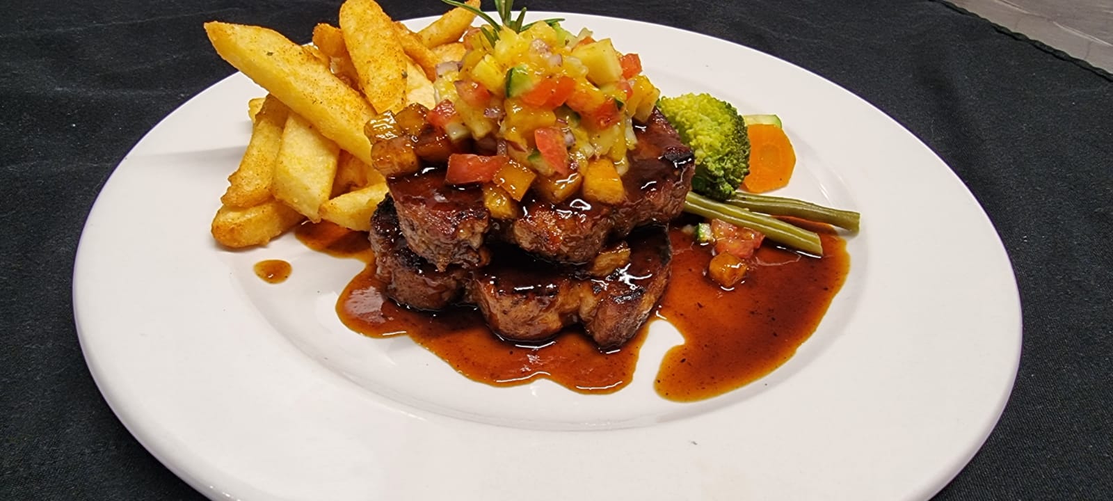 Glazed Pork Neck Steak with Pineapple and Mango Salsa and Rustic Fried - R160.00