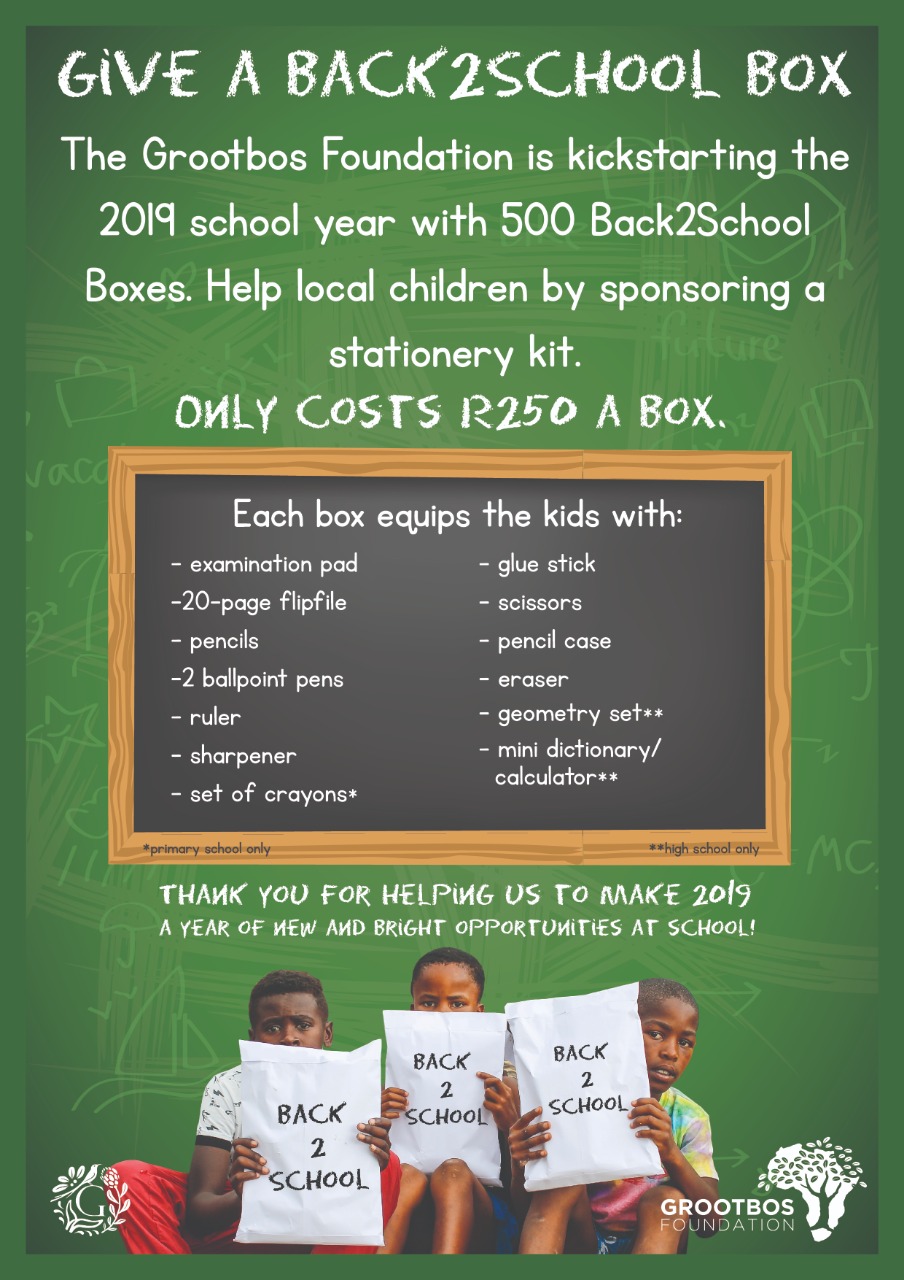 The Grootbos Foundation is kickstarting the 2019 school year with 500 Back2School Boxes. Help local children by sponsoring a stationary kit.