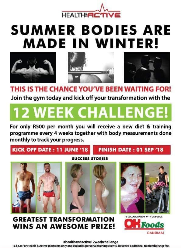 Join the gym today and kick off your transformation with the 12 Week Challenge. For only R500 per month you will receive a new diet & training programme every 4 weeks together with body measurements done monthly to track your progress.