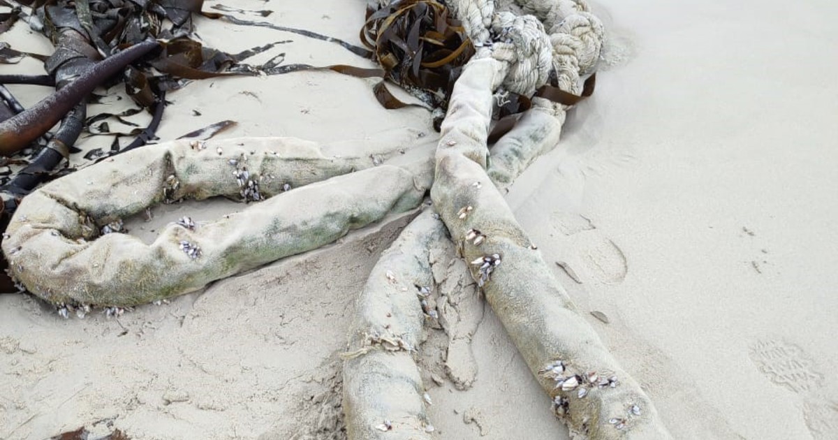 It is now but seldom that a rough sea brings ashore any flotsam of interest. Usually, it is just nurdles and microplastics. Also, plastic bags and bottles, and the occasional lobster trap, or a wooden pallet, or some fishing net. Nothing worthy of much note. So, when I saw some heavy rope entangled with kelp lying just above the high tide mark, I stopped to take a closer look, and I am glad that I did.
