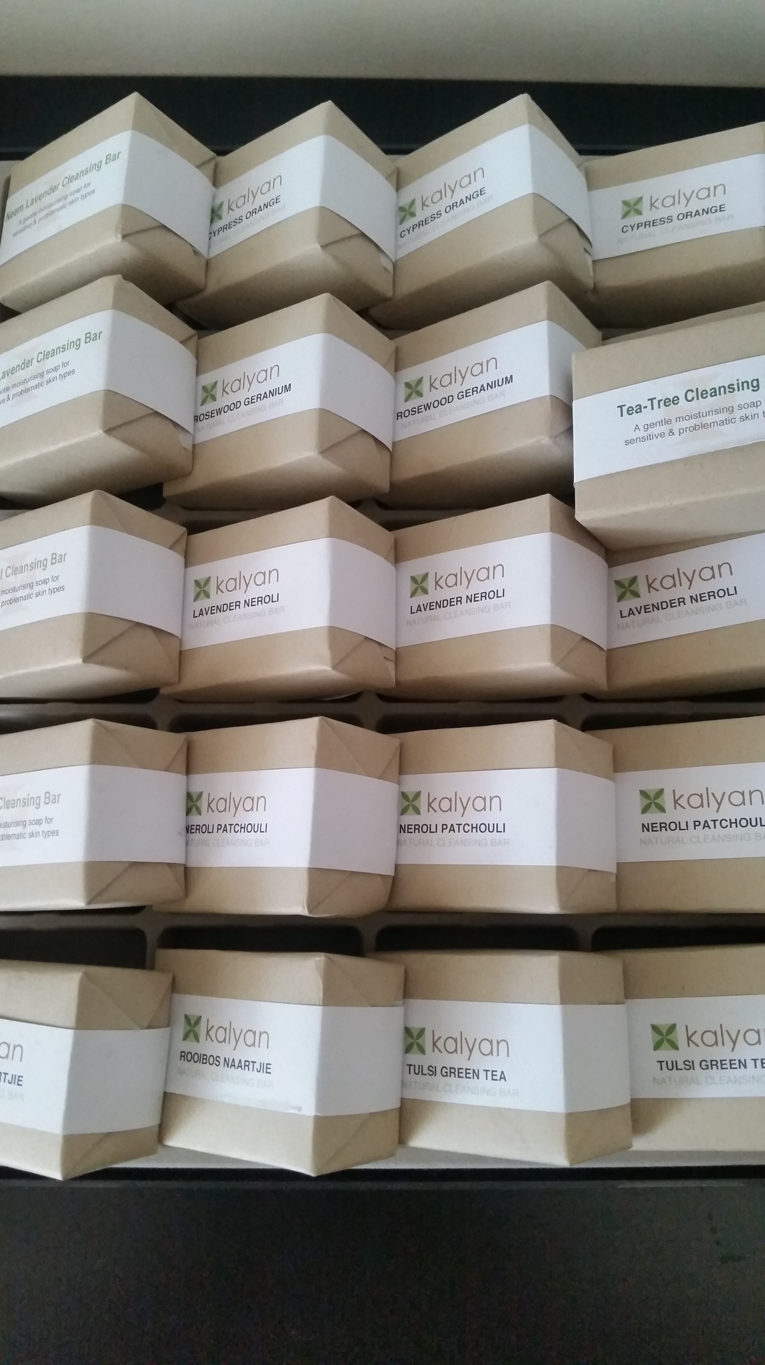 Kalyan soap bars Lemongrass & buchu Lavender & neroli Bergamot & Geranium Neroli & Patchouli Rosewood & Geranium Cypress Orange Lime & Neroli Rooibos & Naartjie Tulsi & Green Tea Neem Lavender Natural