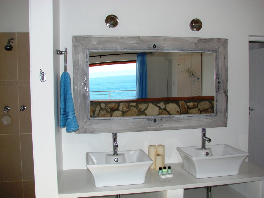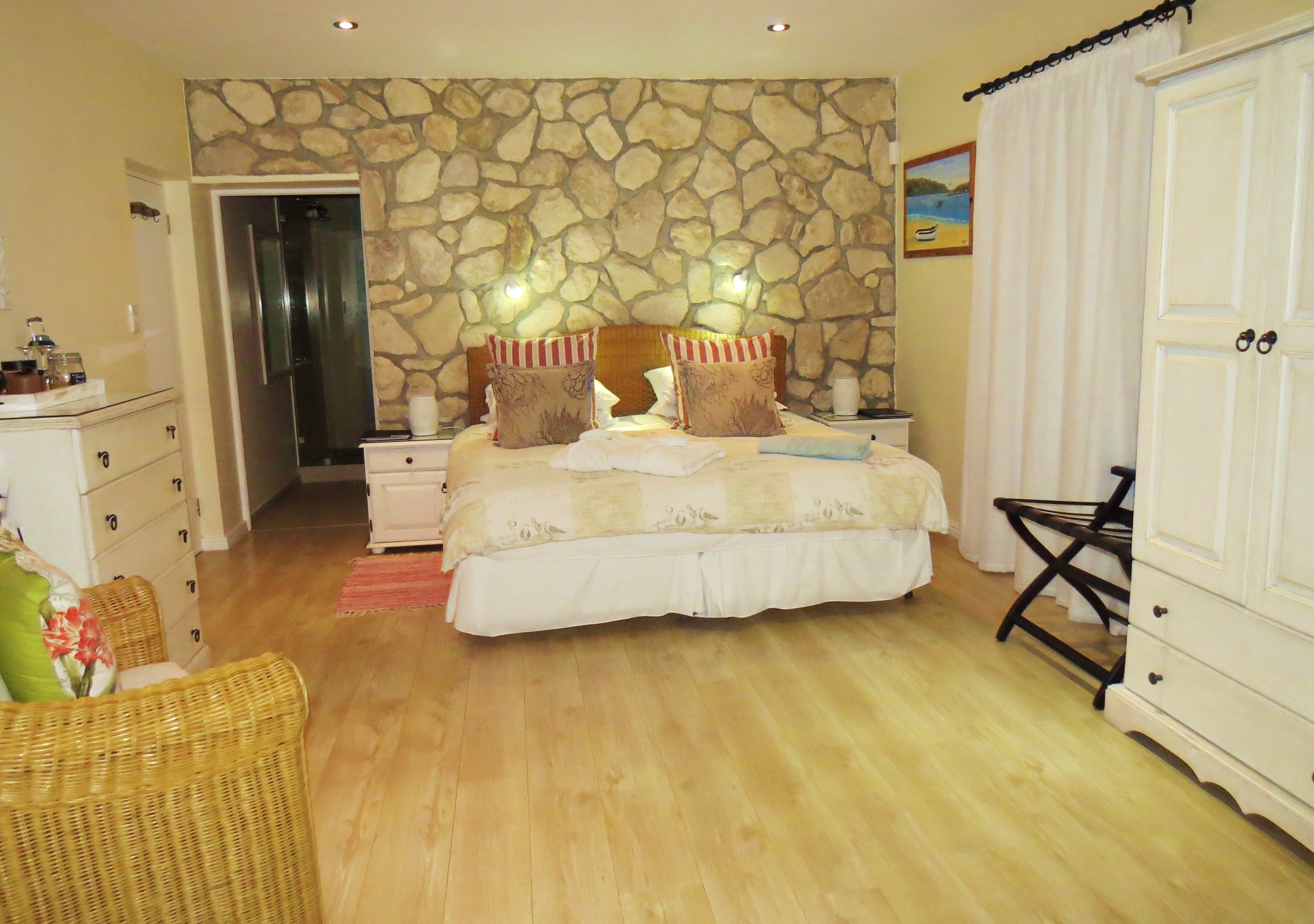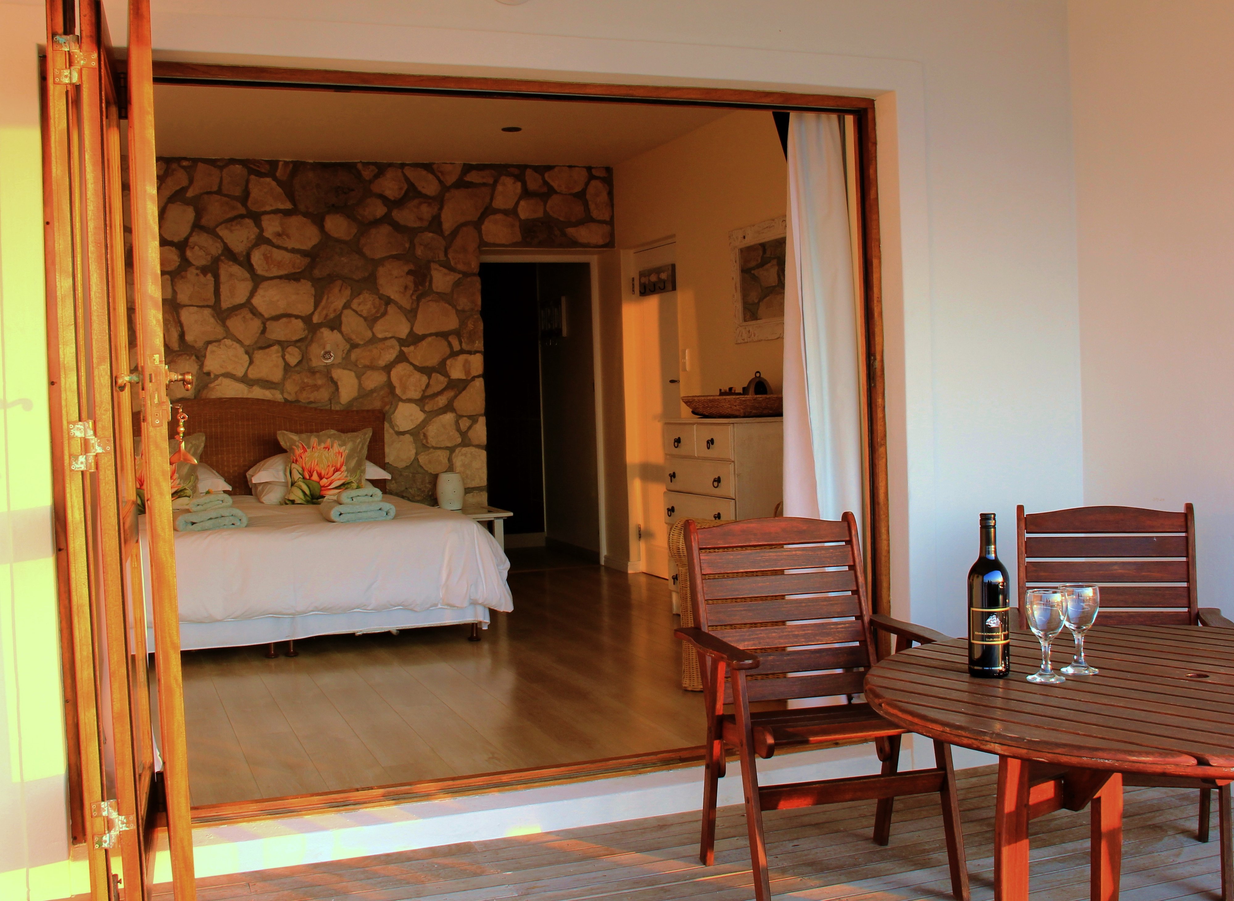 There are two ocean facing suites on the ground level. Concertina doors open the rooms onto private balau wooden decks with deckchairs where one can overlook Walker Bay. One room has a king size bed (Strandlopertjie suite) while the other has twin beds (Protea Suite). Down duvets, percale linnen, bar fridges, coffee making facilities, satelite tv and underfloor heating comes standard. The large en suite bathrooms have victorian baths and pebble floor showers. The size of the room with adjoining bathroom is approximately 40m2.