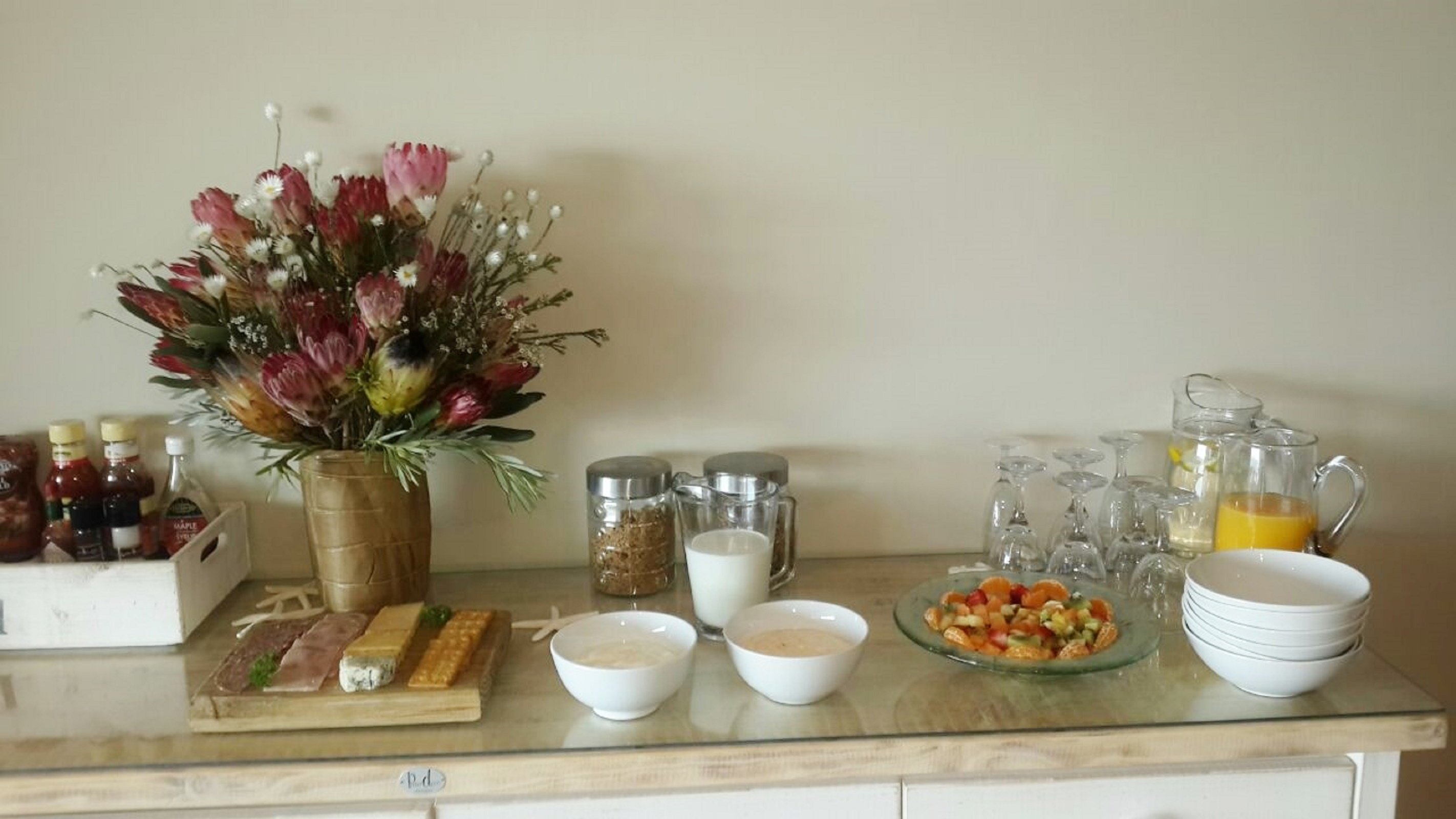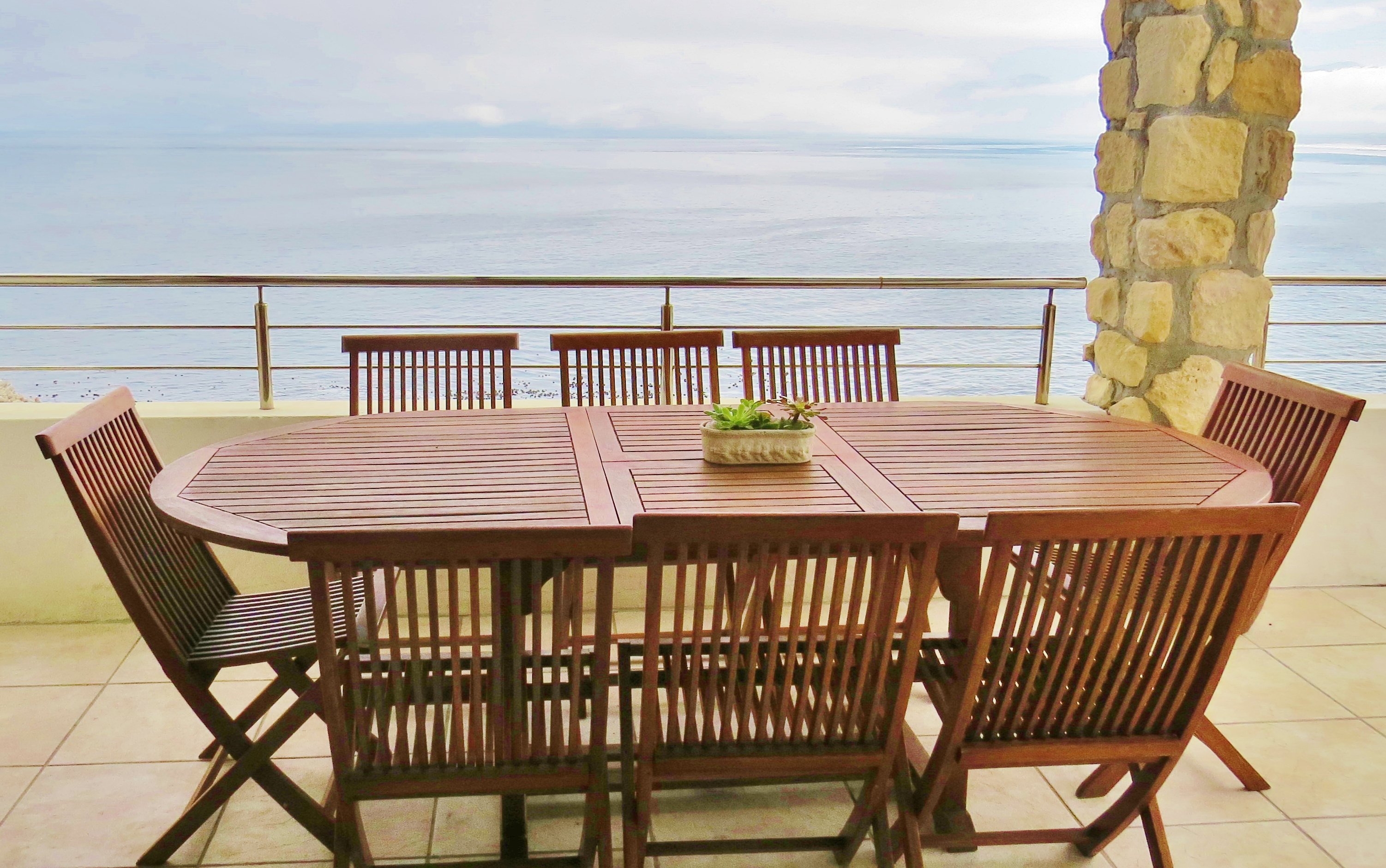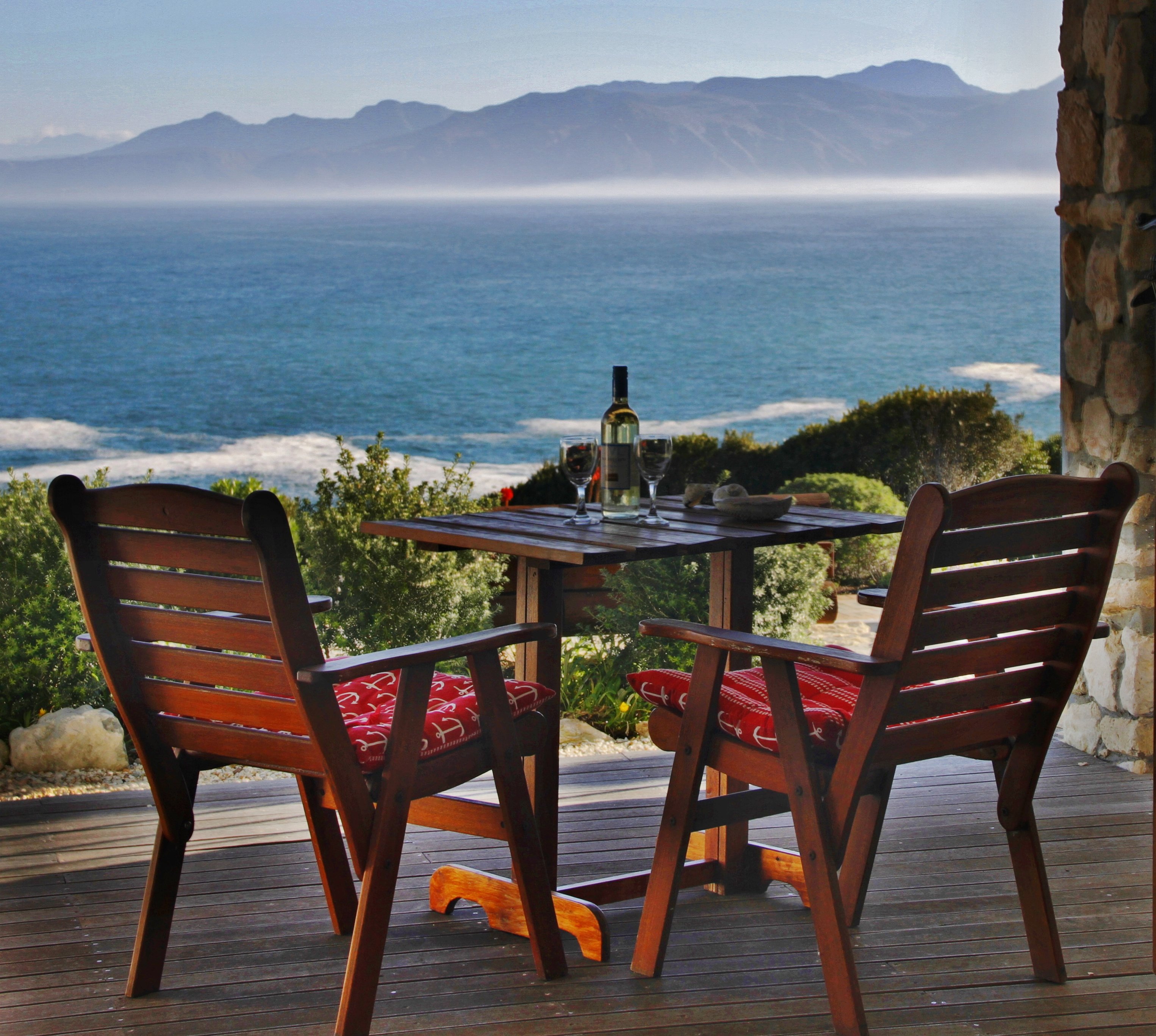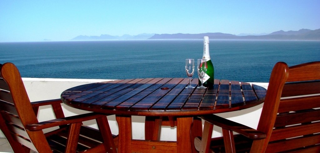 On a clear day breakfast is served on the balcony on the upper level with panoramic views over Walker Bay.