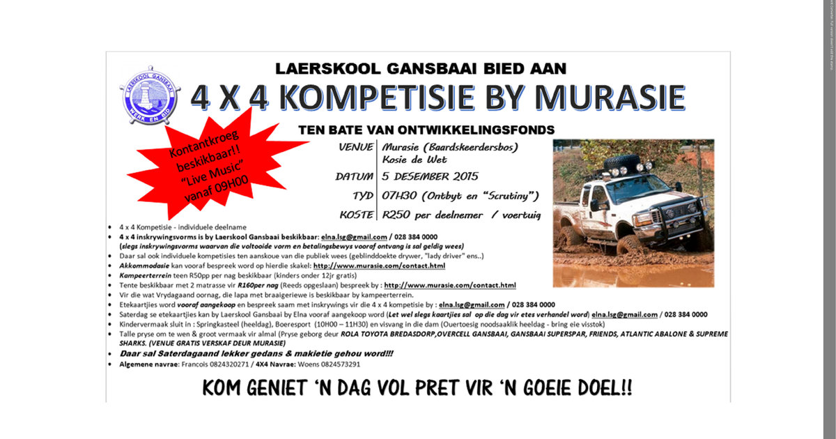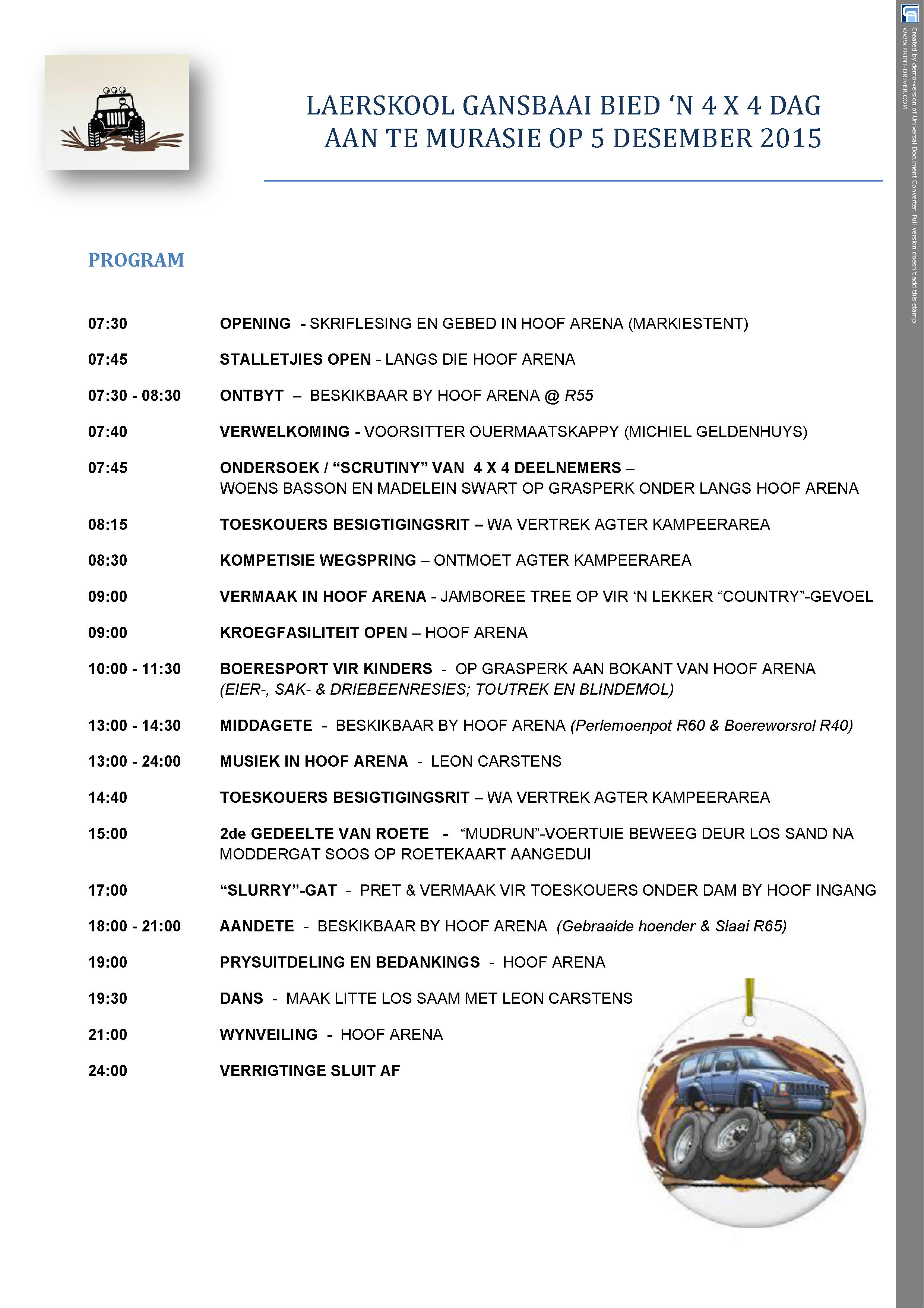 Maak asseblief seker dat julle inskrywings betyds gedoen is aangesien daar 'n beperkte hoeveelheid inskrywings sal wees. Die ete kaartjies moet ook asseblief vooraf by die skool gekoop word.