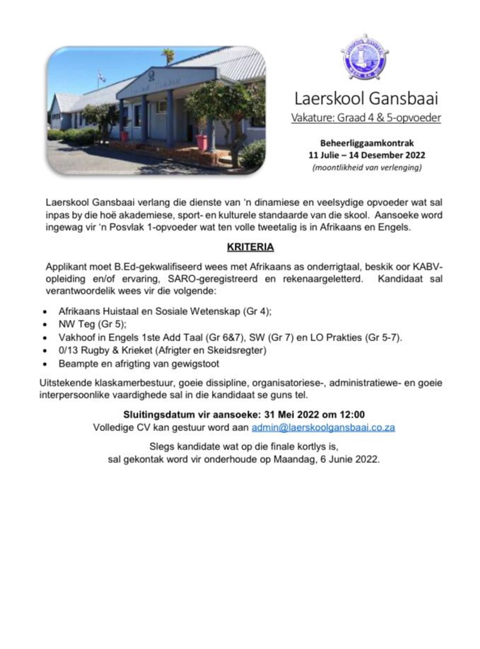 Volledige CV kan gestuur word aan admin@laerskoolgansbaai.co.za