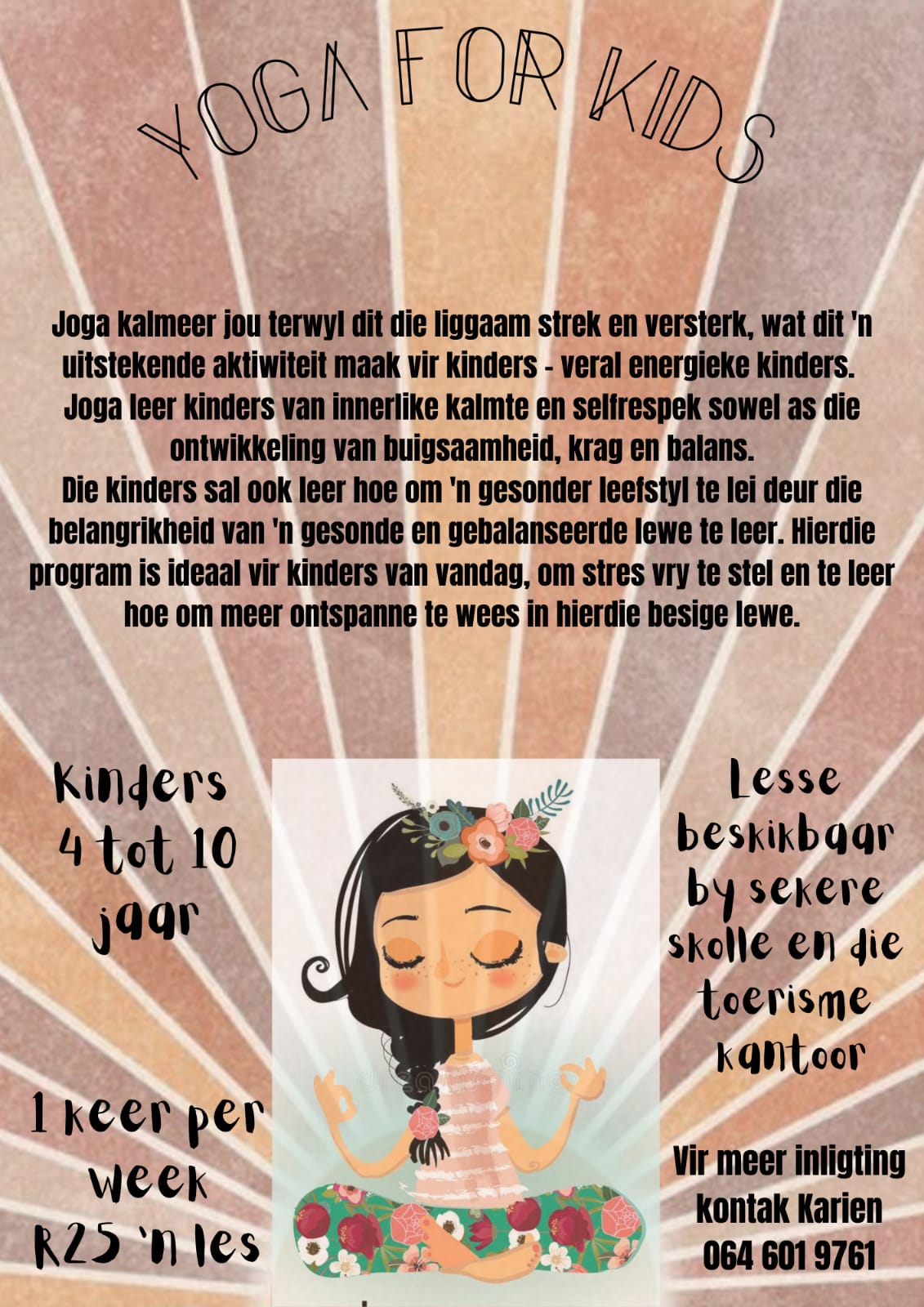 Kiddies yoga classes are available at certain schools in Gansbaai and at the information centre, and is for children ages 4 - 10 years old.