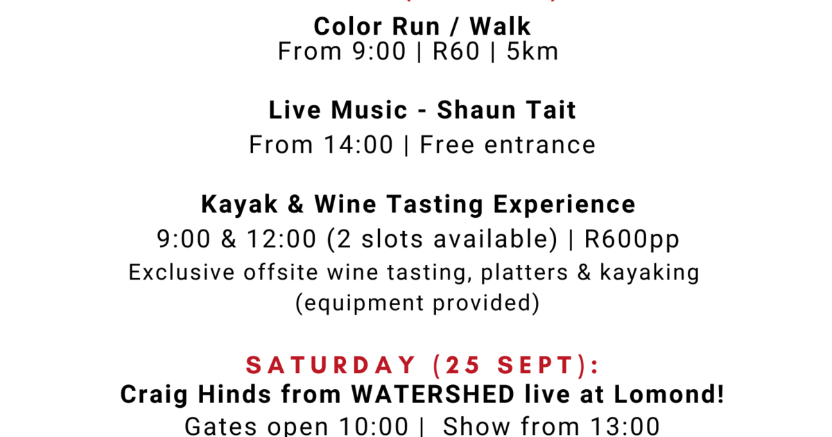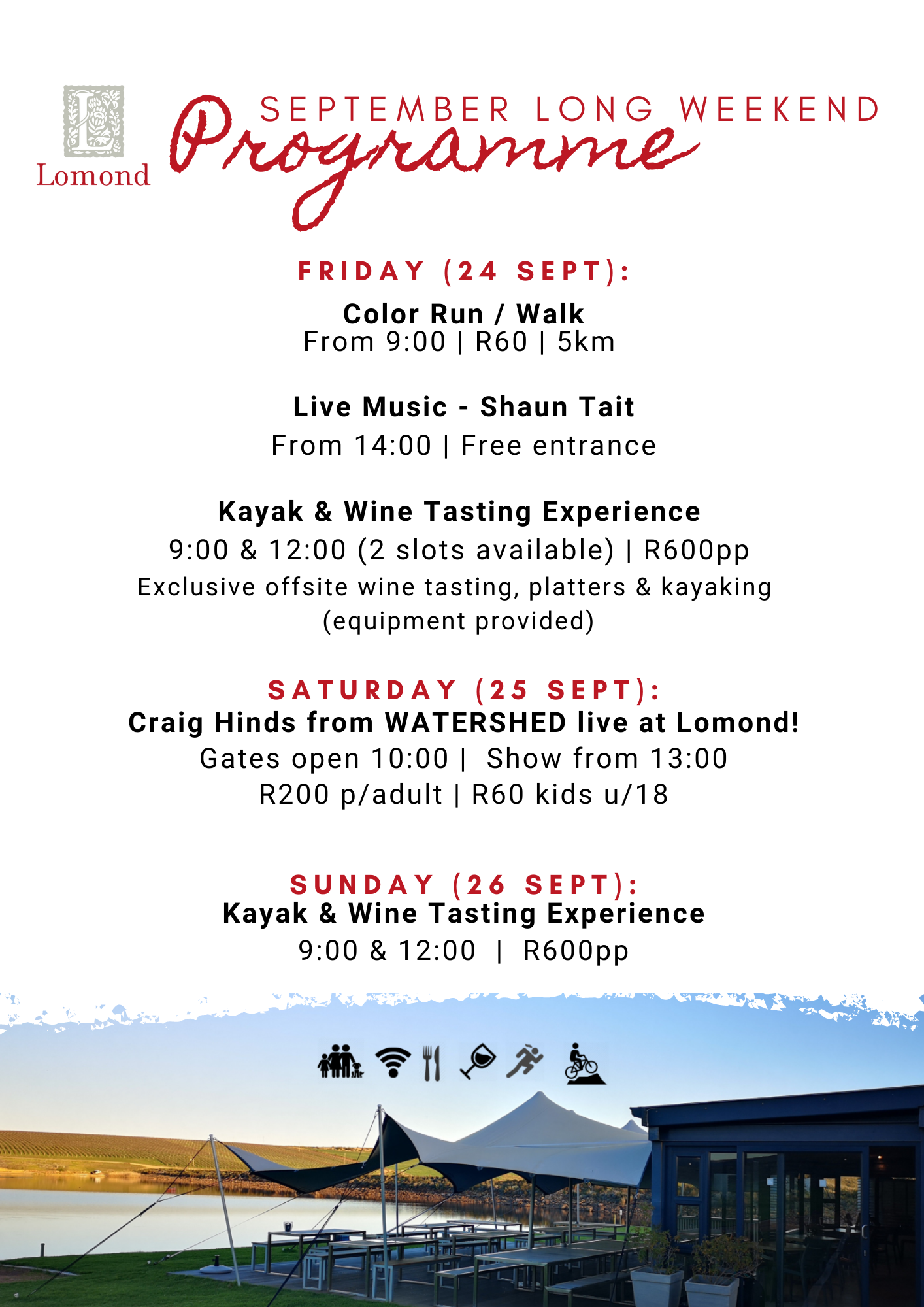 • Exclusive offsite wine tasting, platters and kayaking (equipment provided)