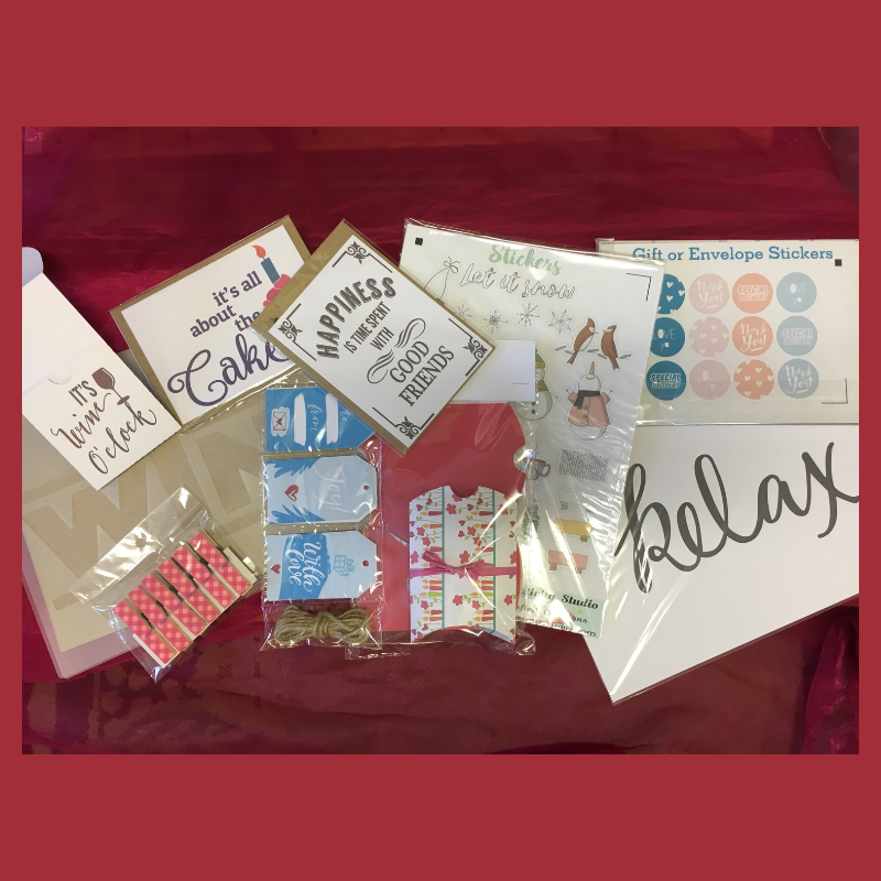 1 Wine Stencil, 1 Bottle Tag, Set of 6 Washi Pegs, 4 Note Cards, 1 A4 Print, Set of Stickers, and a Set of 6 Xmas Gift Tags*