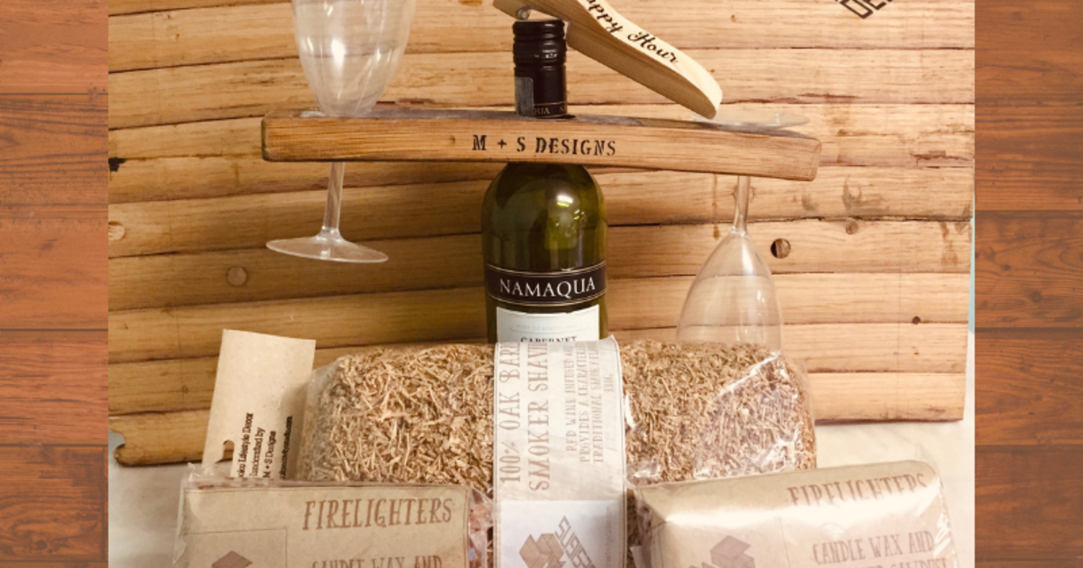 M+S Designs have this wonderful Father's Day Gift Hamper valued at only R250, includes a M + S Designs Wine Buddy (to hold your wine glasses), a M + S Designs Bottle Opener, a packet of M + S Designs Oak Barrel Smoker Shavings and 2 packets of M + S Designs Firelighters. Available from our Studio, opposite Build-It's delivery gate and next to R&R Aluminium. Phone now to place your order: 0645251283