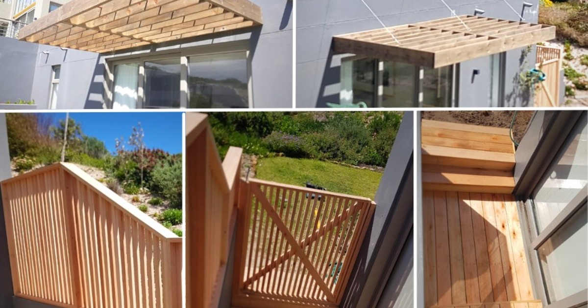 Breathtaking Pagola watching over the sea along with a Saligna deck and railing to close off the outside beach shower at Romansbaai Beach & Fynbos Estate designed and manufactured by M+S Designs.