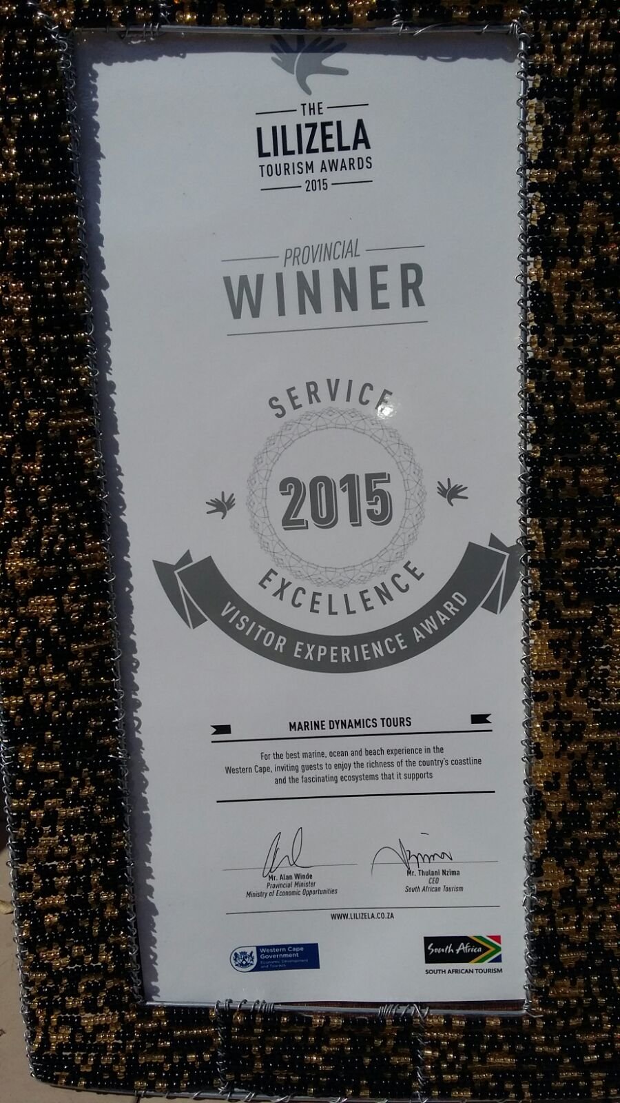 We are proud to announce that Marine Dynamics received the 2015 provincial Lilizela Tourism Awards for the best marine, ocean and beach experience in the Western Cape.