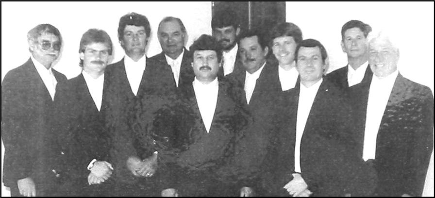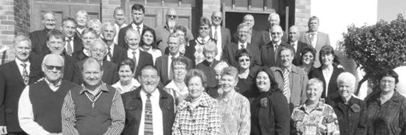 Vyf pa’s en seuns wat saam in die kerk-raad in die 1980’s gedien het, foto onder (v.l.n.r.) Lammie Fourie en sy seun Adri, Boetie en sy pa Johnny (Mike) Germishuys, ds. Bosman, Wimpie en sy pa Willem Niemand, Alwyn en sy pa Jan Naudé en Hentie van Rhyn en sy seun.