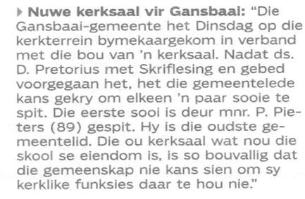 1987 : Eerste egpaar om in die kerkraad te dien: Kallie en Annatjie Liebenberg was dié egpaar. Annatjie was terselftertyd die eerste vrou om in die kerkraad te dien. Saam het hulle vir verskeie termyne as diaken en/of ouderling in die NG kerkraad gedien.