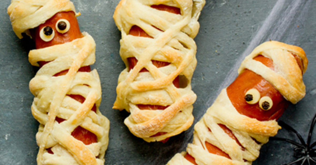5. Prepare a baking sheet with a non-stick spray. Place the mummies, face up on the tray and paint them lightly with egg white.