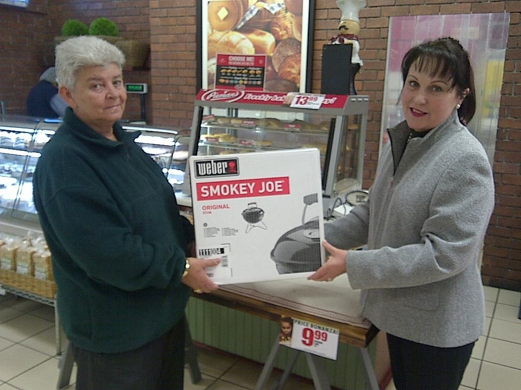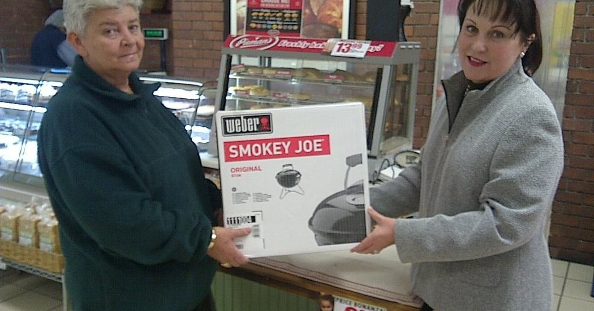 Mev Anna van Dyk van Gansbaai is die gelukkige wenner van 'n Smokey Joe Weberbraai in die Piemans kompetisie. Petra van Rensburg van OK het haar prys oorhandig. Baie Geluk!