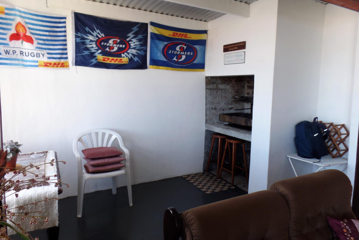 - Indoor braai area with curtain rails and wood fireplace
