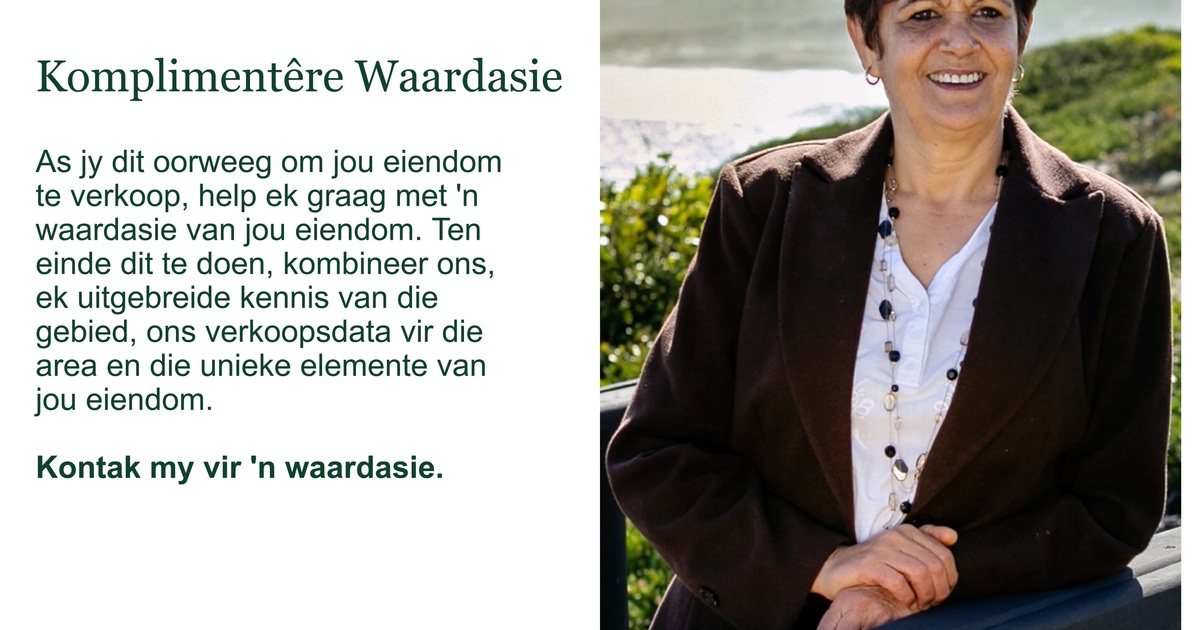 As jy dit oorweeg om jou eiendom te verkoop, help ek graag met 'n waardasie van jou eiendom.