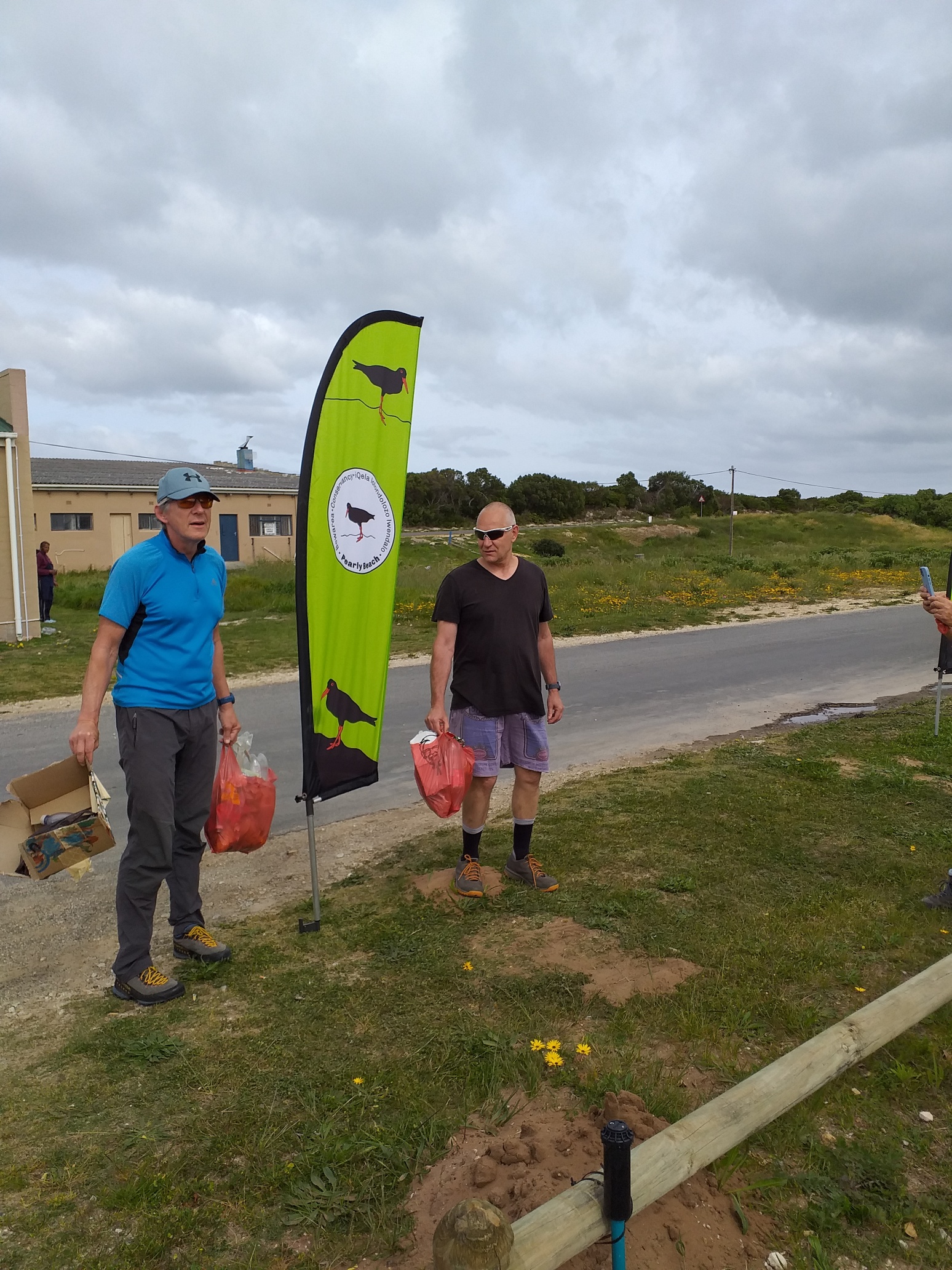 The Pearly Beach Conservancy hosted a walk through the Strandveld vegetation of Pearly Beach on Heritage Day to celebrate the village’s natural heritage. The weather was sunny and warm and the spring flowers along the coast were wide open to greet us. The tide was just right for the beach part of the walk. On the beach we even had the privilege of meeting a Cape fur seal. Since the Overstrand Municipality has postponed the mowing of road verges until after the flowering season, many different flowers were on show in the village (the Esplanade in particular). As usual, we ended up picking up several shopping bags full of rubbish as well. The Conservancy also took this opportunity to officially inaugurate its green flags and its fresh new, multilingual logo featuring the iconic black oystercatcher.