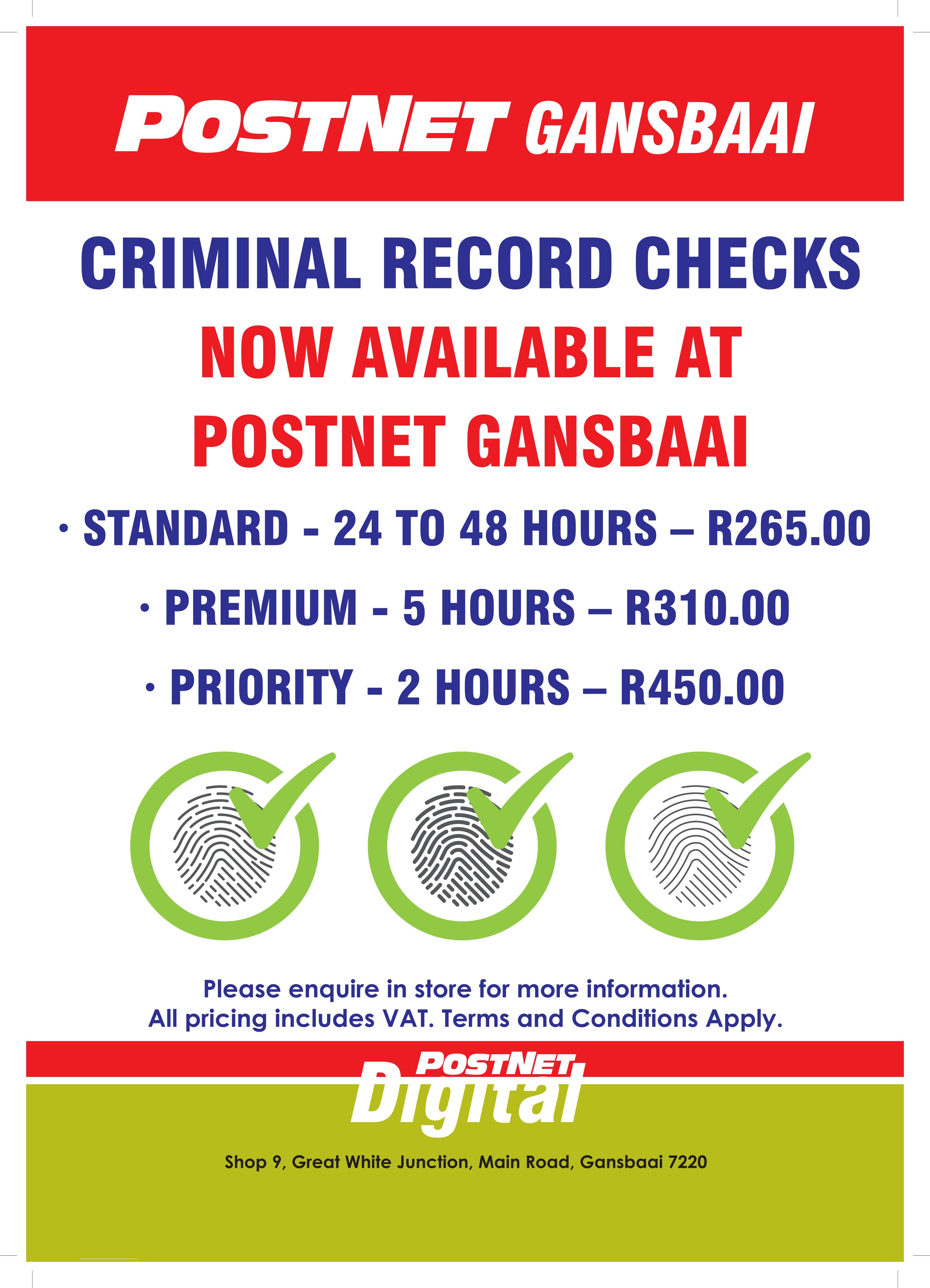Postnet Gansbaai provides HURU criminal record checks (CRC) to determine whether or not a person has a criminal record in South Africa.